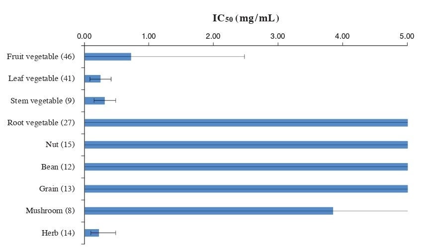図1に試験結果を載せています。メカブ抽出エキスには、濃度依存的な抗糖化活性が認められ、本試験からIC50値を算出した結果、0.64 mg/mLであることが示されました。この結果から、野菜カテゴリー別の抗糖化活性(図2)と比較しても優れた生理学的効果を有していることが分かりました。