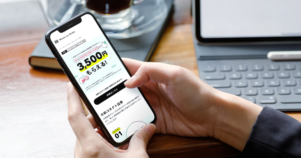 ご利用方法 | ① みんなの銀行アプリの「マイページ」を経由して大和コネクト証券の証券口座を開設することで、大和コネクト証券が提供する資産運用サービスをご利用いただけます。 ② ①の流れでお申込みいただくことで、みんなの銀行テンプスタッフ支店をご利用のお客さまを対象とした特別な優遇プログラムやキャンペーン等の特典が受けられます(※1)。 ※1 みんなの銀行アプリの「マイページ」を経由せずに大和コネクト証券の証券口座を開設した場合、②の特典は対象外となります。 |