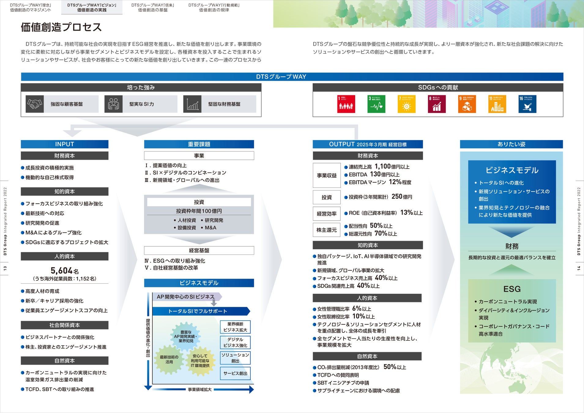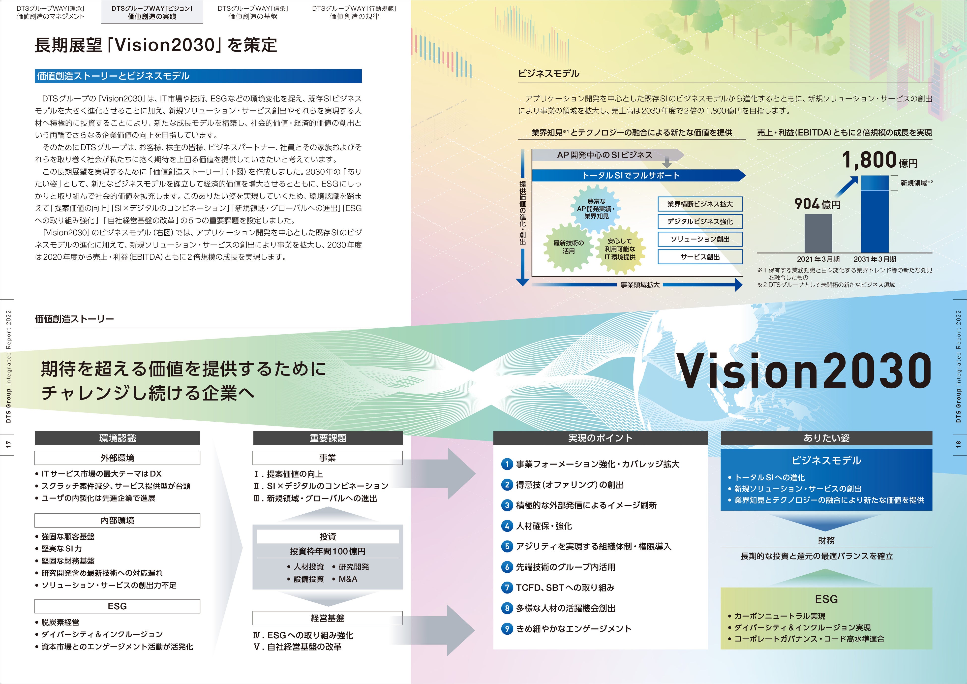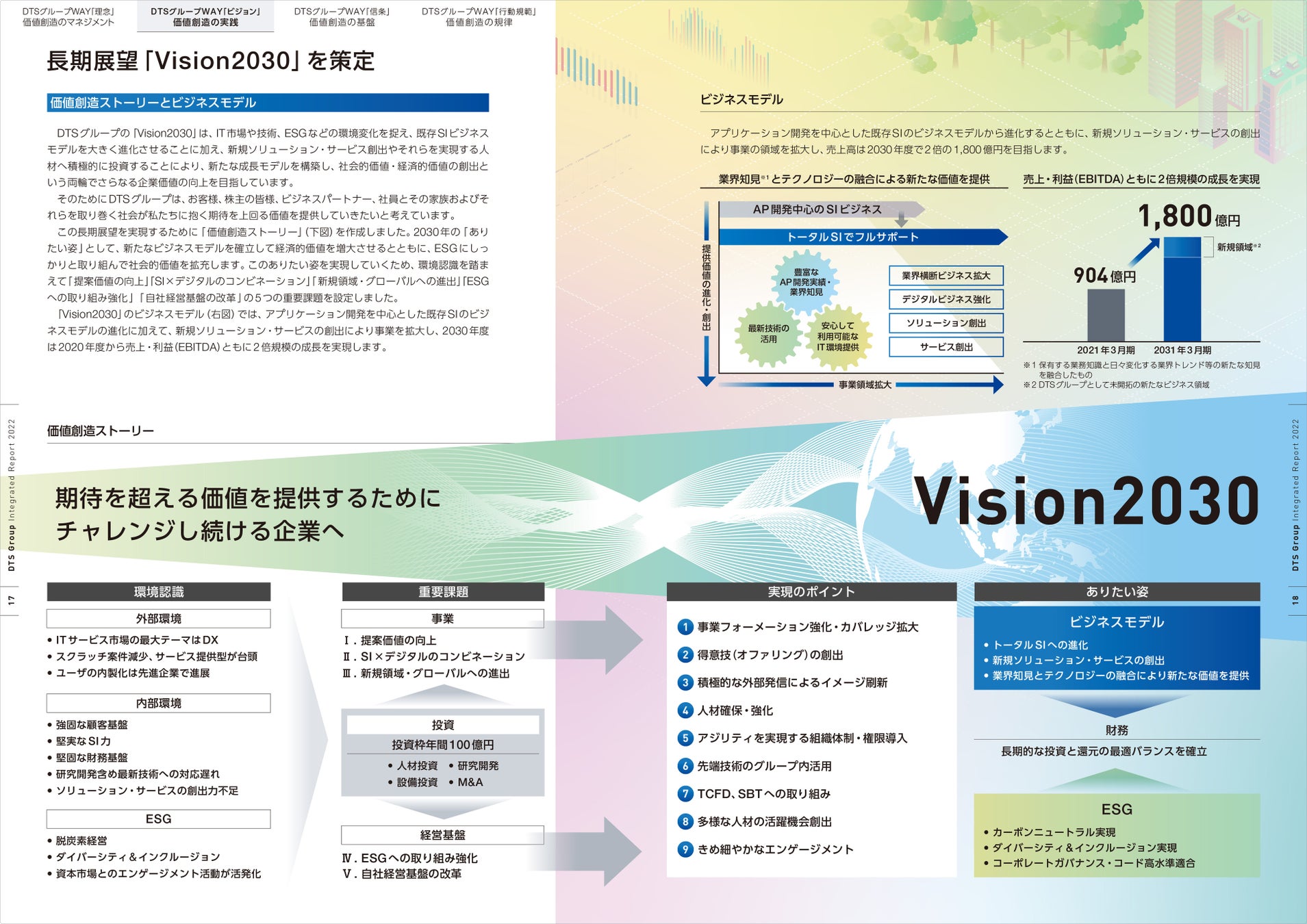 本報告書では、2022年4月に新たに策定した長期展望「Vision2030」と中期経営計画を紹介するとともに、ビジョンとして掲げた「期待を超える価値を提供するためにチャレンジし続ける企業へ」の実現に向けた中長期的な視点でのDTSグループの価値創造プロセスや、新たな事業セグメント、注力して取り組むビジネス領域等のビジネスモデルの変革について説明しています。