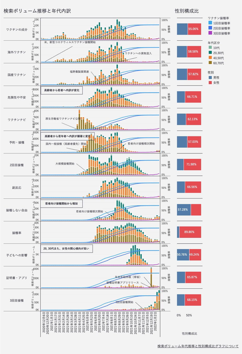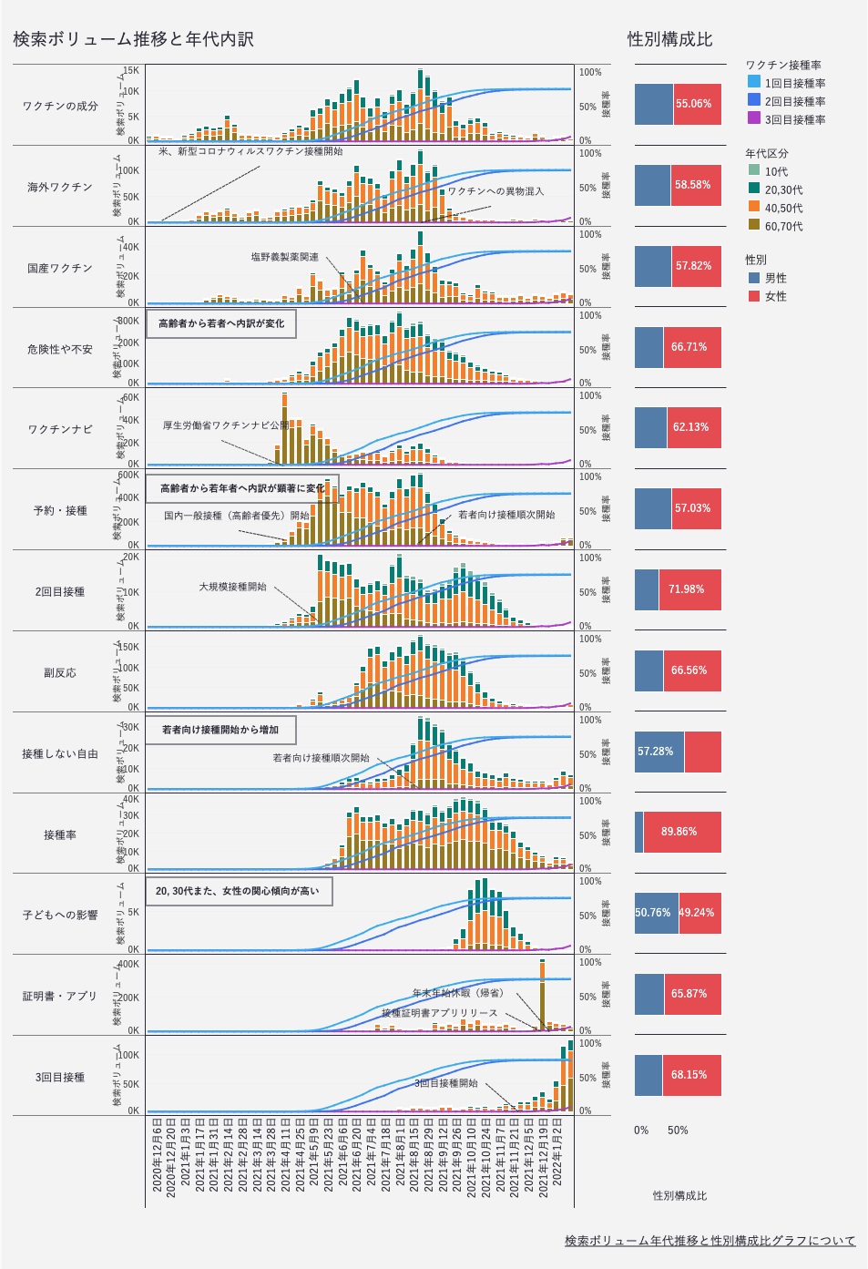新型コロナウイルスのワクチン接種が始まってから約1年が経ちます。現在では2回目のワクチン接種を終えた人は8割を超えていますが、開始当初は不安の声や予約が取れないといった声も多く、状況も関心事もこの1年で大きく変化してきました。今回のレポートでは、検索データを活用して新型コロナワクチン接種への関心の変遷を分析・考察しました。
