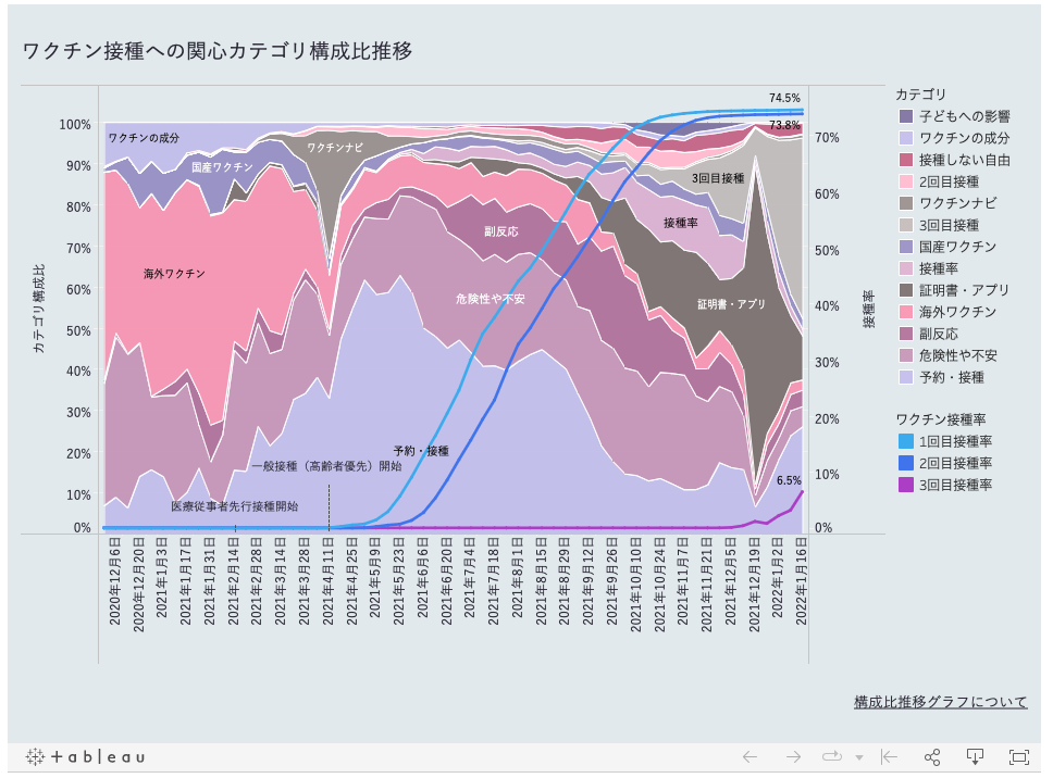 まず、「ワクチン」と一緒に検索されたキーワードをカテゴリーに分類し、カテゴリーに検索数を合算のうえ構成比を算出して、積み上げ面グラフにしました。(データ期間:2021年11月29日~2022年1月23日)あわせて、ワクチンの接種率(1~3回目)も折れ線グラフで示しています。