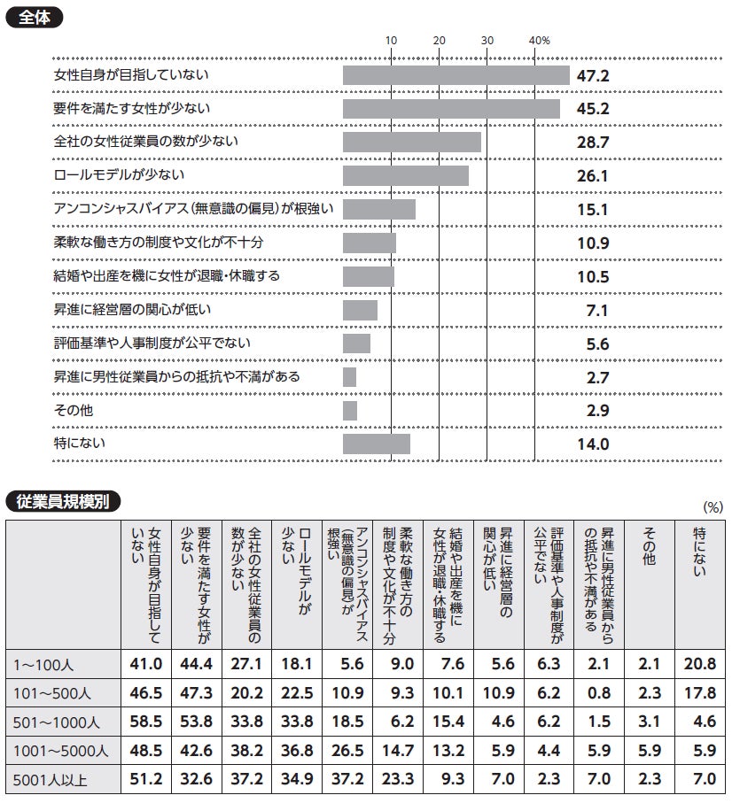 課長相当職への昇進の課題で最多は「女性自身が目指していない」