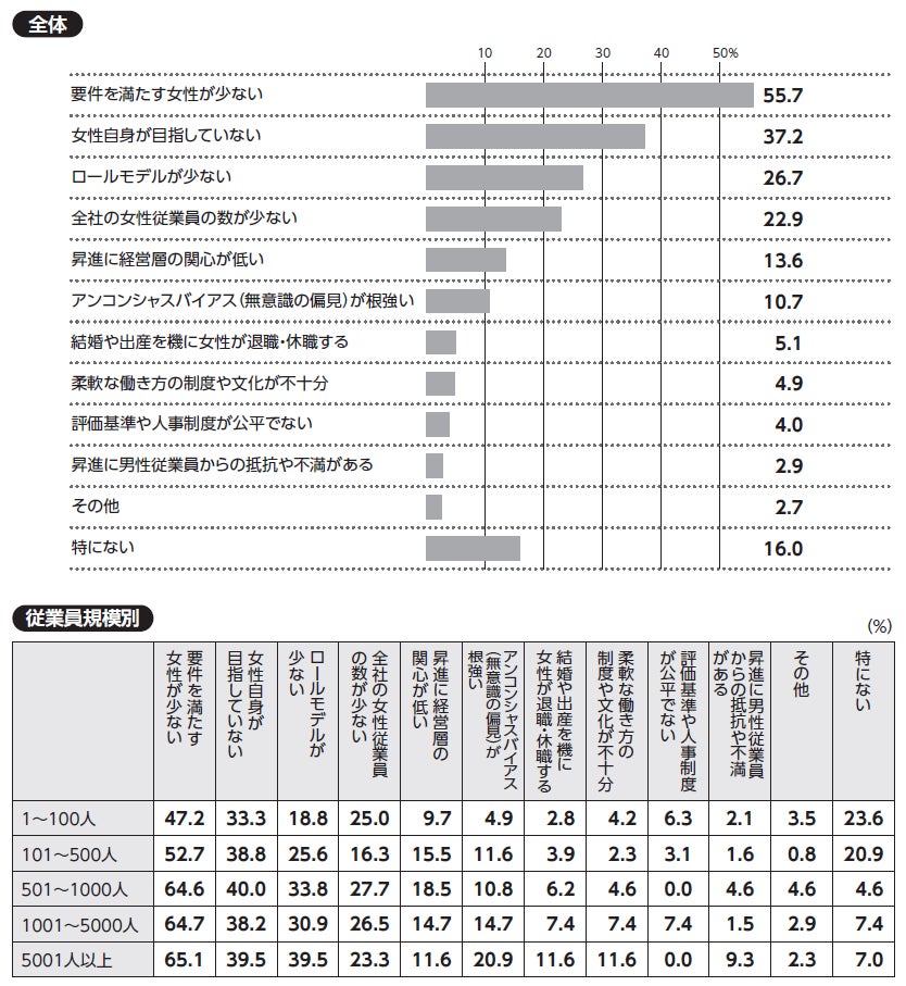 女性の管理職・役員登用、課題は「要件を満たす人が少ない」「女性が目指していない」「女性の数が少ない」「ロールモデルの不在」「アンコンシャスバイアス」