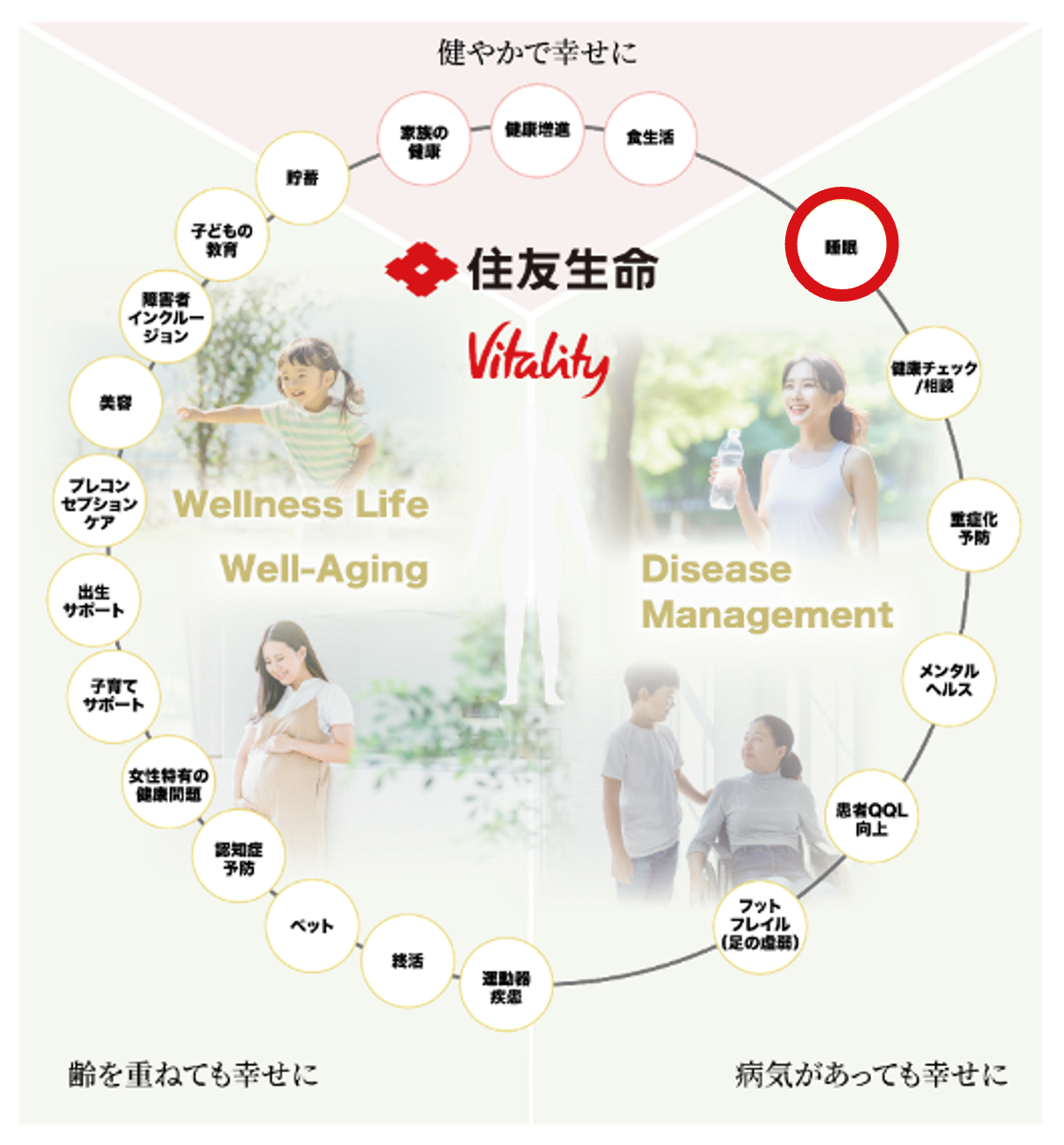 住友生命は、お客さまの健康増進をサポートするVitality健康プログラムを中心としたWaaS(Well-being as a service)※2を通じてお客さまのウェルビーイングに資するサービスの提供を目指しています。