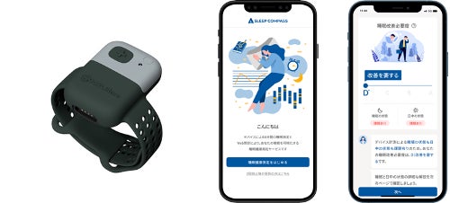 図1:『SLEEP COMPASS』 腕装着型睡眠測定デバイスと画面