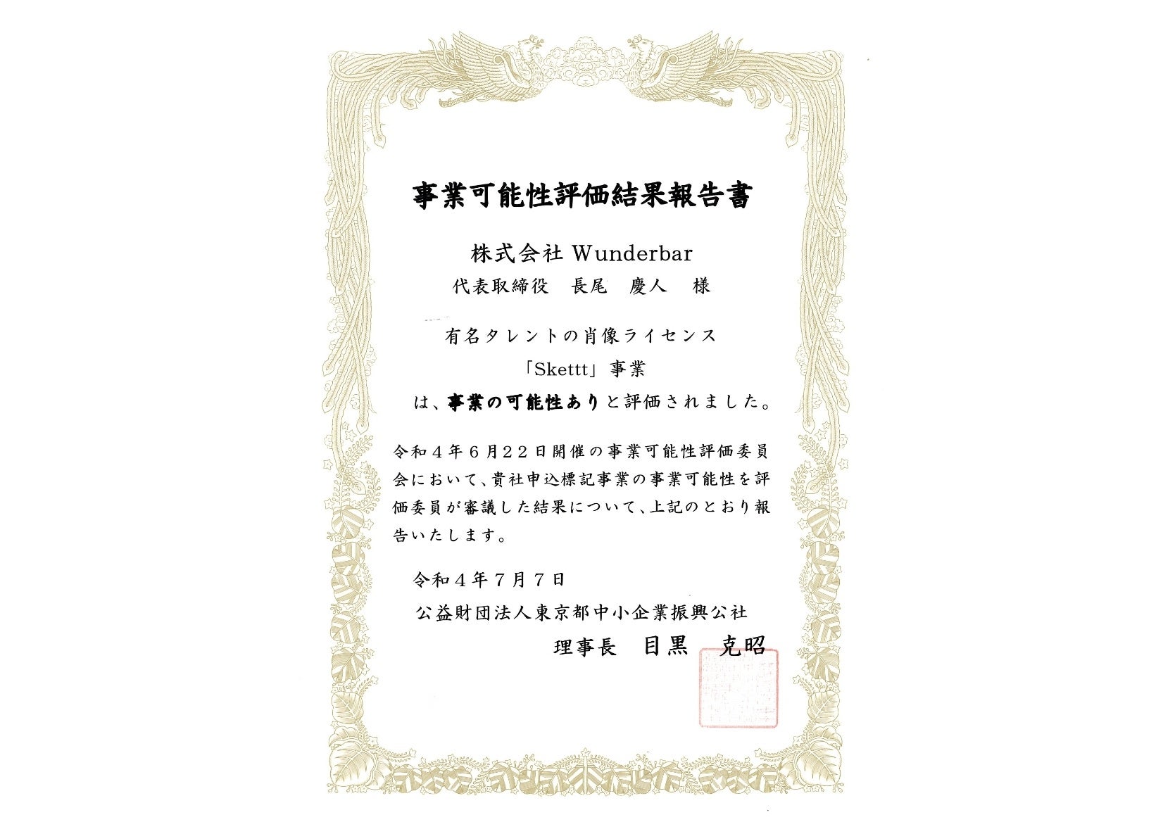 株式会社Wunderbar(本社:東京都江東区、代表取締役:長尾慶人)は、公益財団法人東京都中小企業振興公社の事業可能性評価事業において、有名タレントの肖像ライセンス「Skettt(スケット)」事業が、「事業の可能性あり」との評価を頂きました。
