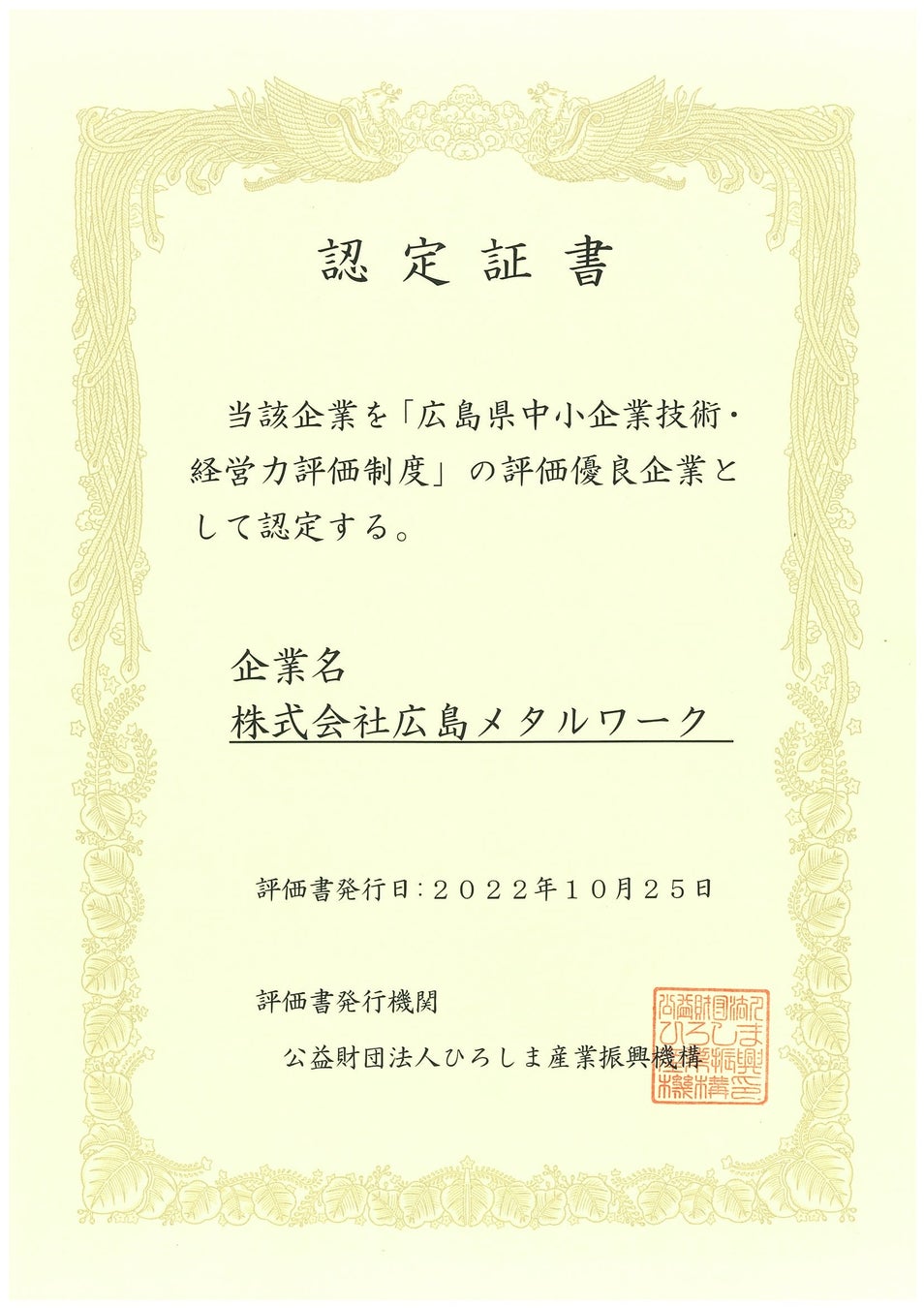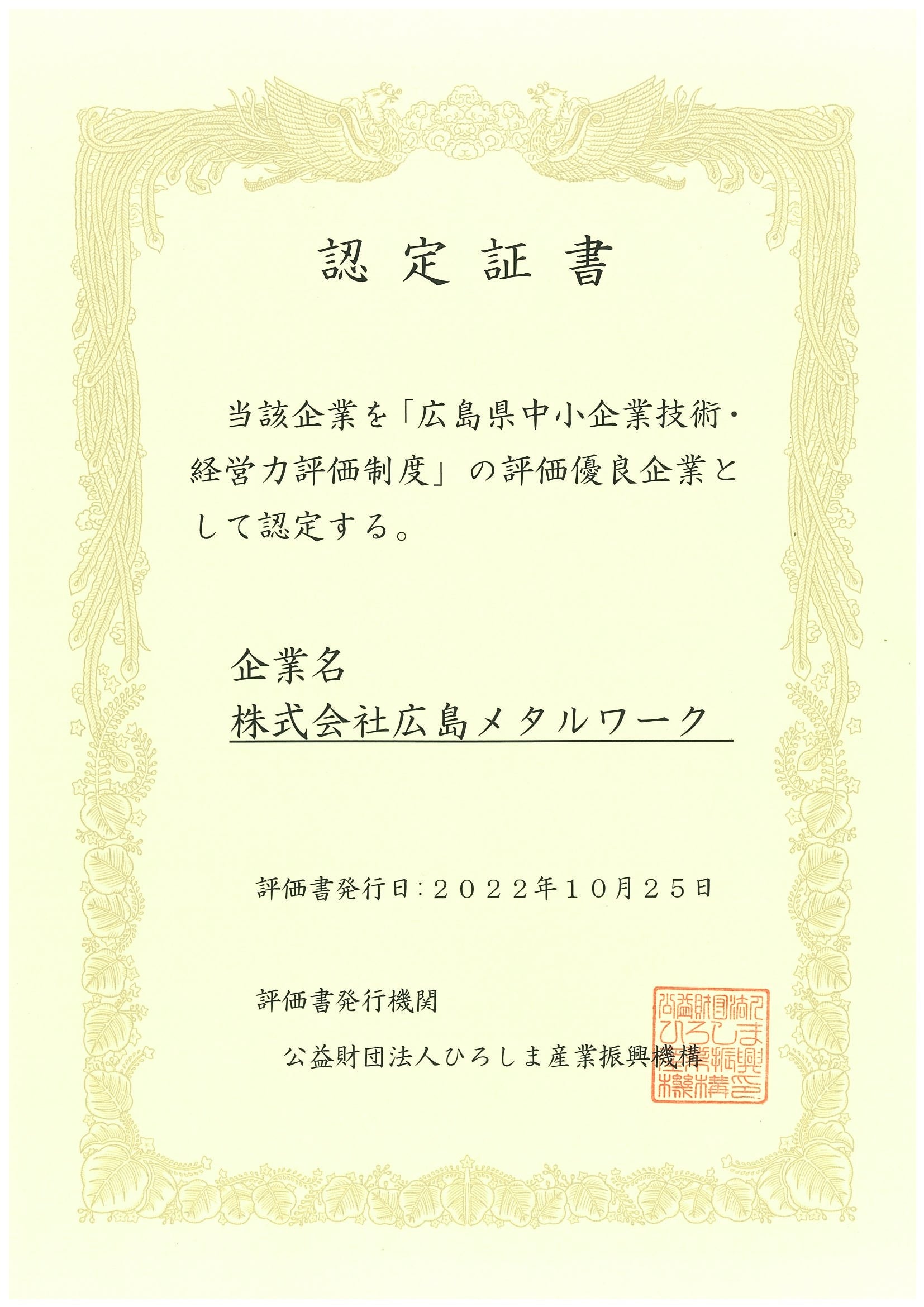 金属製品製造・加工を行う株式会社広島メタルワーク(本社:広島県、代表者:前田 啓太郎)は、公益財団法人ひろしま産業振興機構が運営する中小企業技術・経営力評価制度において、「評価優良企業」に認定されたことをお知らせします。