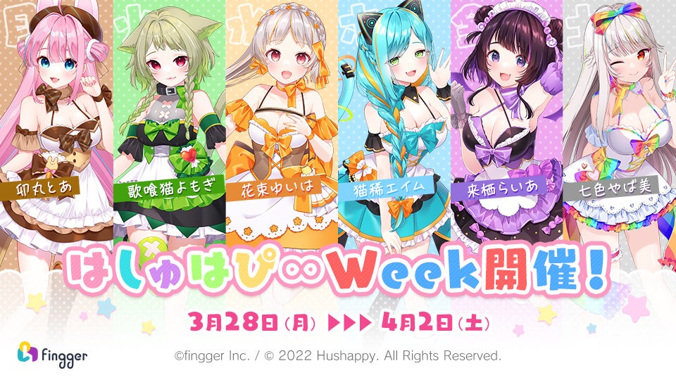 イベント期間中は「はしゅはぴ∞」メンバーから、「卯丸とあ」「歌喰猫よもぎ」「花束ゆいは」「猫稀エイム」「来栖らいあ」「七色やば美」の、6名が『fingger』の様々なゲームを配信します。