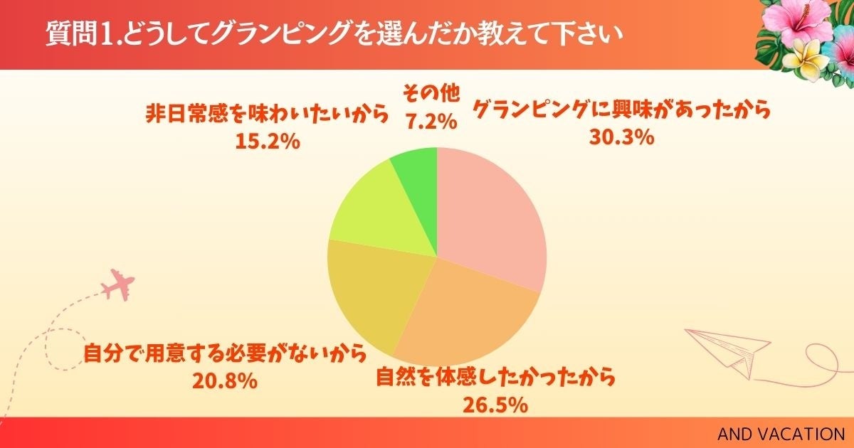 そこで、今回のアンケートではグランピングで宿泊した人に、どうしてグランピングを選んだのかをお聞きしました。気になる人は、ぜひチェックしてみてください!