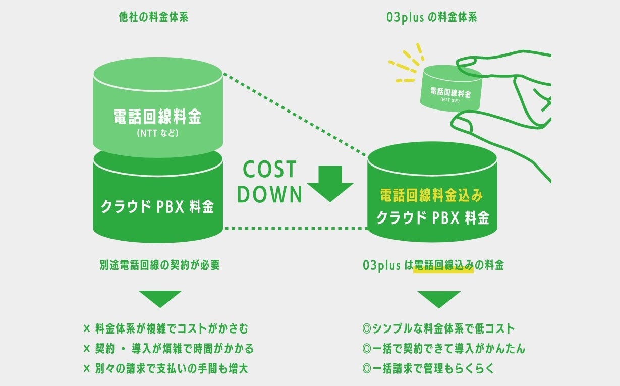 03plusのサービス基本料は「電話回線料⾦込み」のため、サービス料⾦とは別に電話回線料⾦がかかる他のクラウドPBXに⽐べ、ランニングコストを抑えることが可能です。