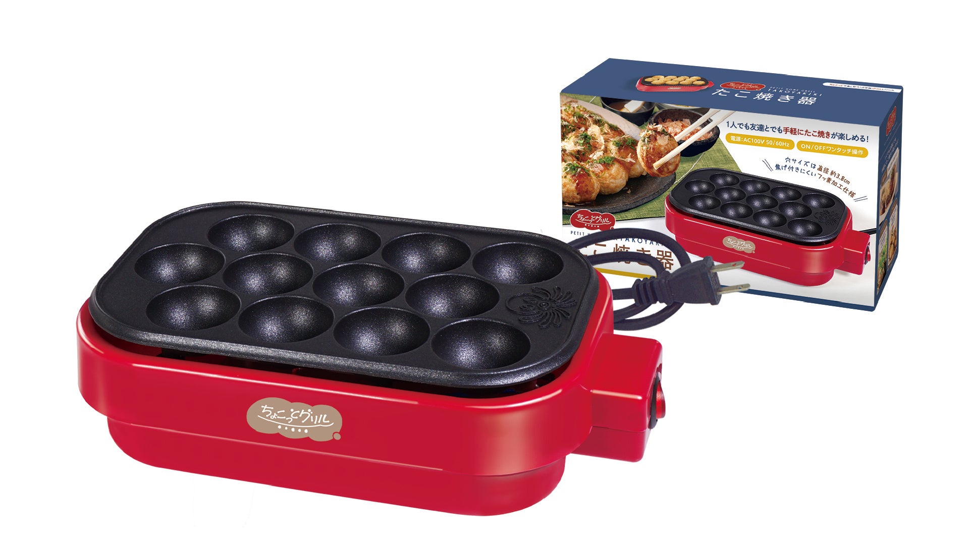 特徴:美味しく焼き上げる卓上たこ焼き器。12穴の卓上サイズなので1人用としてもご使用できます。焦げ付きにくいフッ素加工で表面をこんがりと焼き上げます。タコを入れたり、ちくわを入れたり、チーズをのせたり、焼き上がったたこ焼きを美味しくアレンジしてみよう!