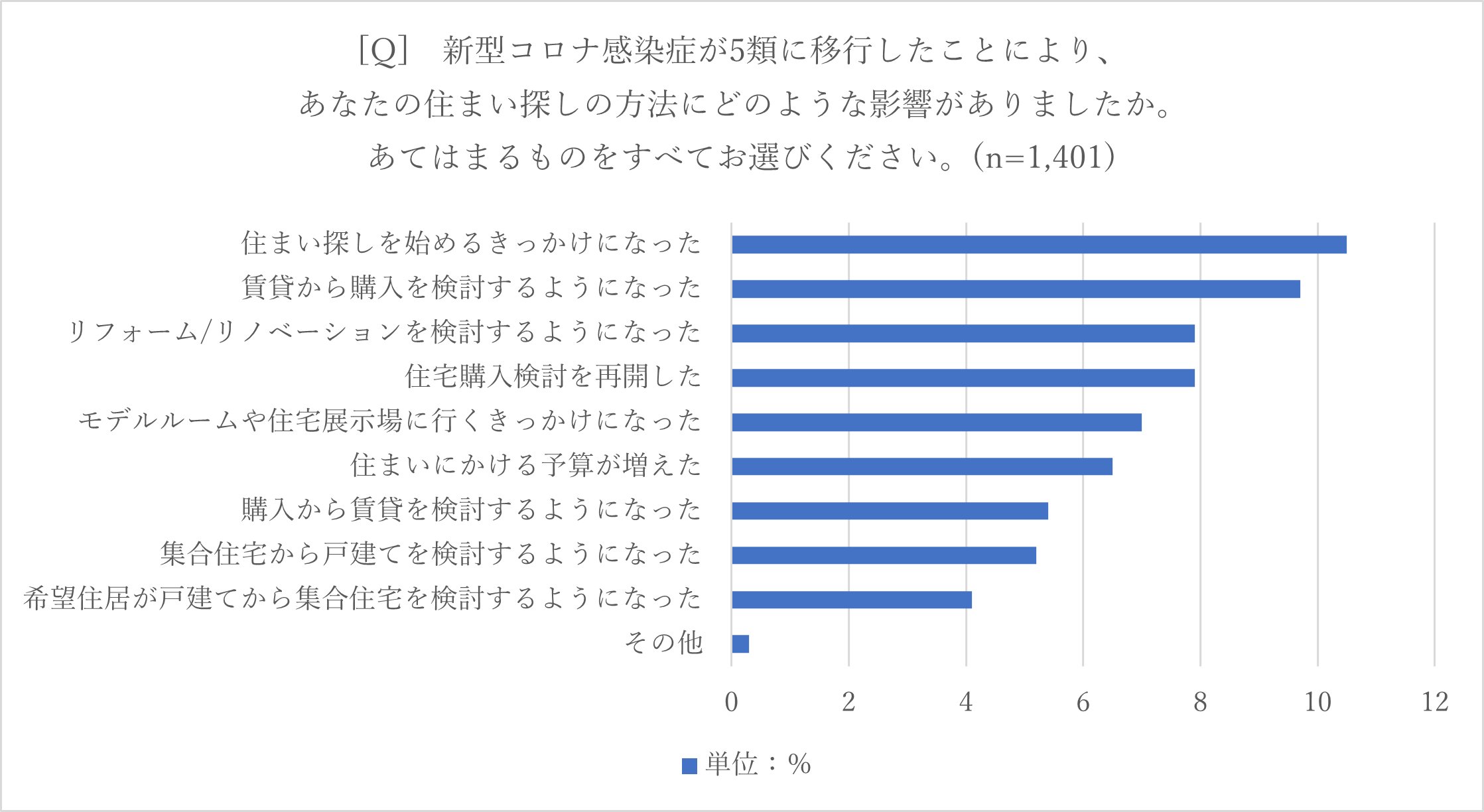 ・その他、20-30代では、「住まい探しを始めるきっかけになった」という回答、40-50代はコロナ禍にはストップしていた「住宅購入検討を再開するようになった」という回答がそれぞれ上位に上がった。
