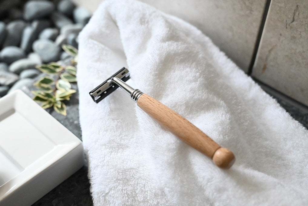持ち手が木製の髭剃り。ゴミの削減にも考慮し2枚刃の髭剃りを採用。