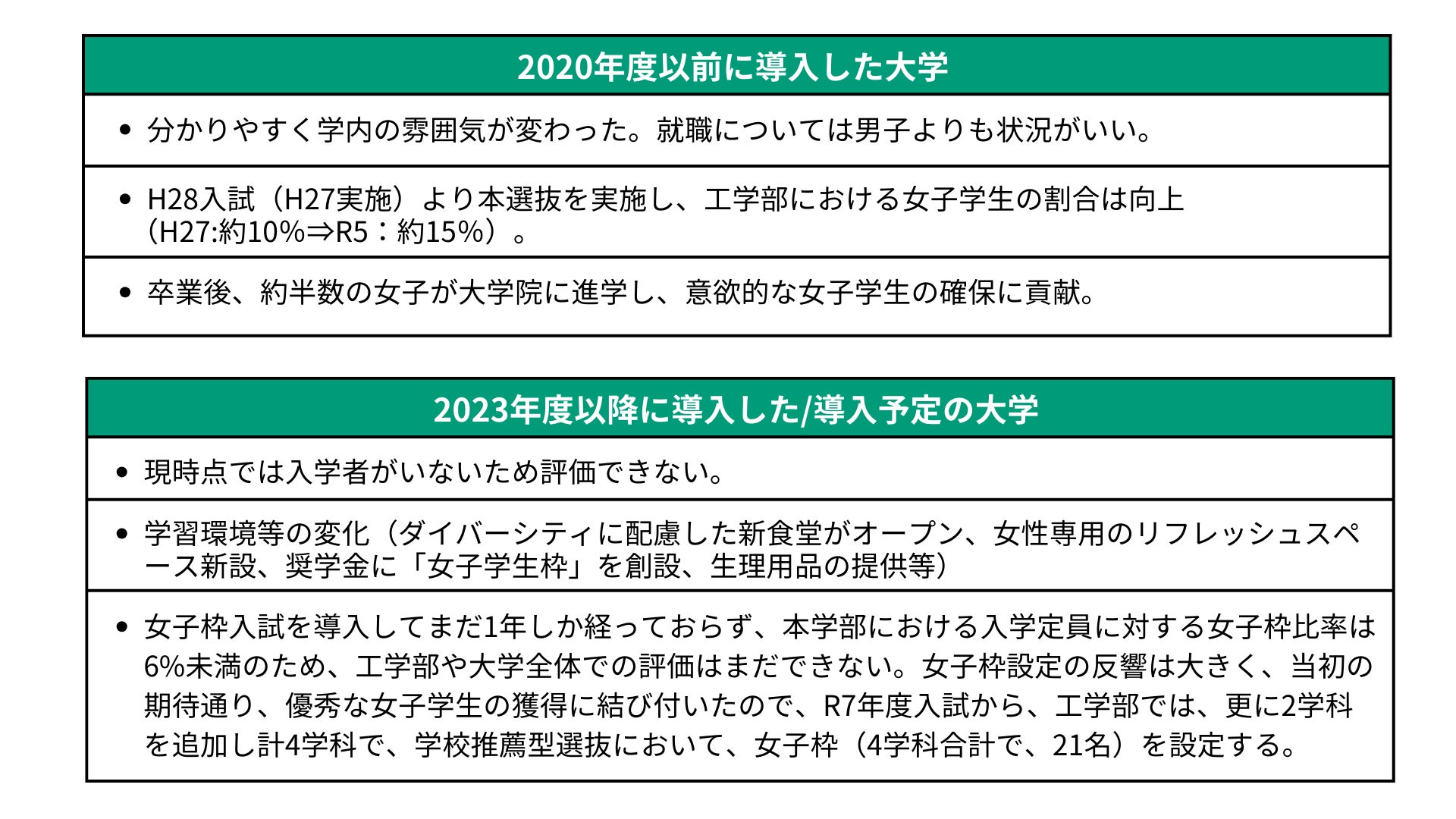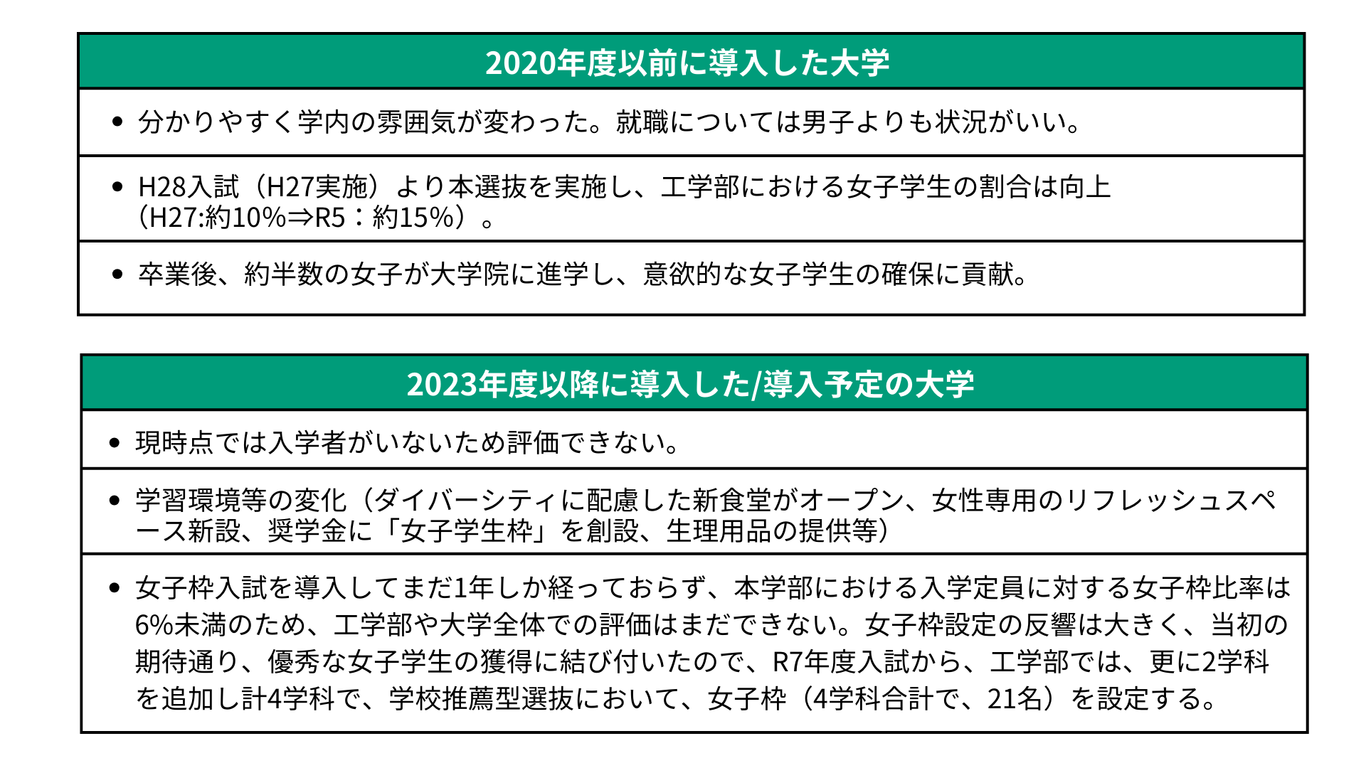 「女子枠」入試を導入した大学においては、導入時期による成果の違いが出ている。2020年度入試以前からの導入大学では、2016年度入試の導入から8年で10%だった工学部の女子学生比率が15%となったり、卒業後、約半数の女子が大学院に進学し、意欲的な女子学生が研究面でも貢献するなど、具体的な成果が出た。