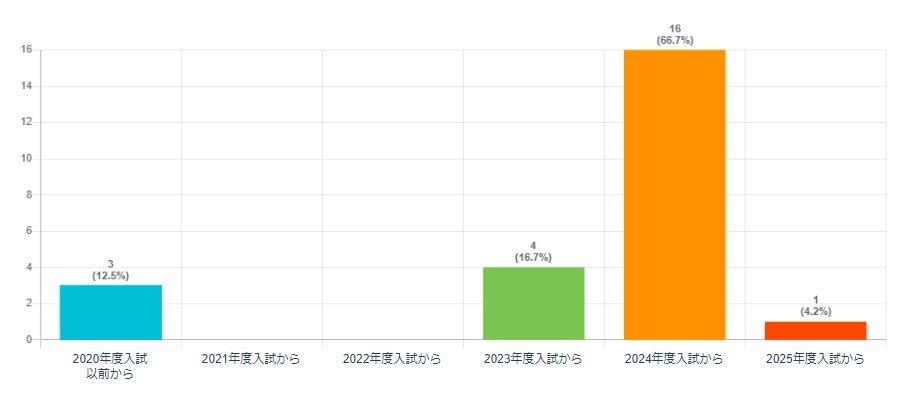 2020年度以前に「女子枠」入試を導入した大学は3校(12.5%)、2023年度以降に導入したのは21校(87.5%)。「女子枠」制度への関心が急速に高まっていることを示した。