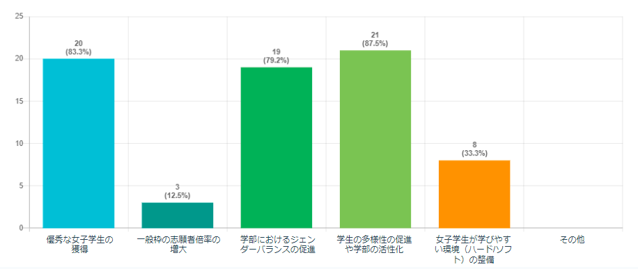 一方で、入学した女子学生にとって学びやすい環境(ハード/ソフト面)や入学後のサポートに関する期待は3割程度で、副次的効果としての期待にとどまった。今後の取り組みにおいては、これらの要素も具体的に検討がなされ、女子学生が充実した学びの場を得るための環境整備が進むことが期待される。
