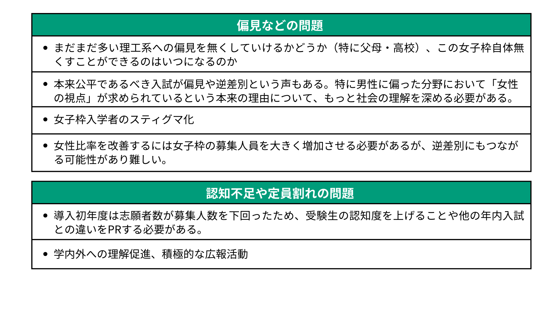 「女子枠」入試導入にあたって、大学内外からの否定的なコメント等があった大学が、45.5%と約半数を占めており、偏見や逆差別への対処として、制度の目的や必要性を社会に明確に発信し、女子枠入学者のスティグマ化を防ぐ対策が必要とされている。その他、導入したばかりの大学においては認知不足や志願者不足に対処するために、積極的で効果的な広報活動が不可欠との回答があった。