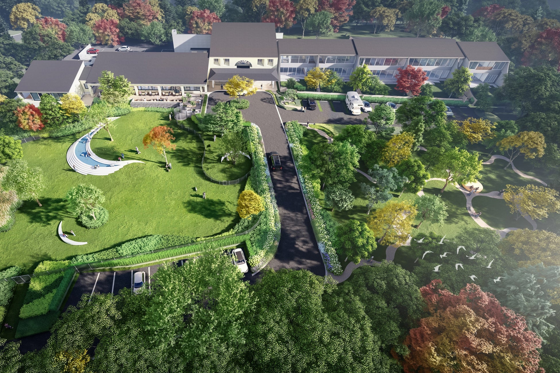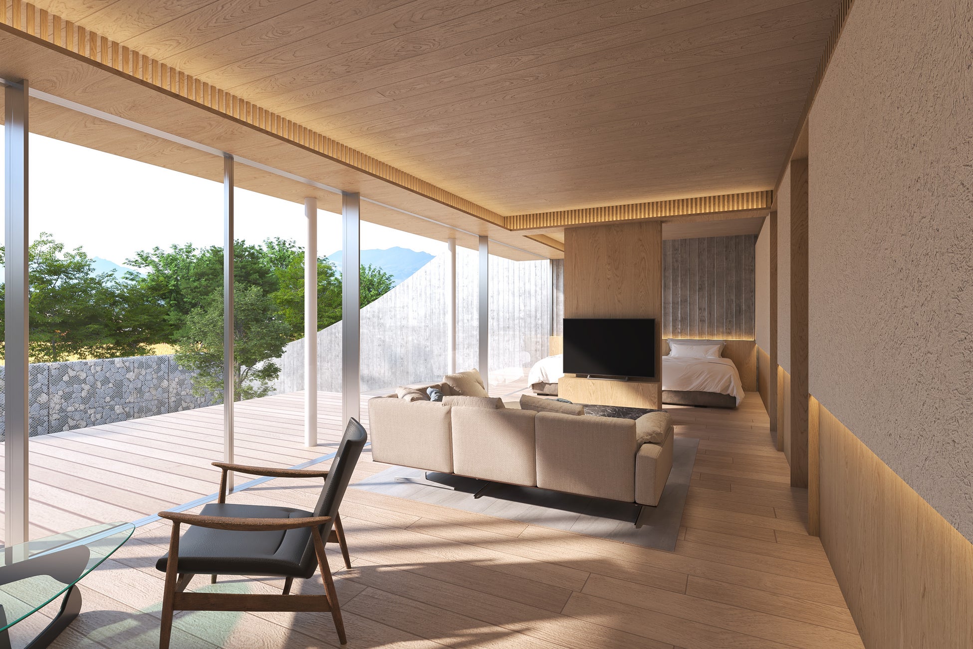 ホテルのコンセプトは、自然と建物が調和することで、愛犬にも人にも居心地の良い環境を目指すという考えのもと「RETURN TO NATURE(自然への回帰)」に決定しました。“RETONA HAKONE”の特長は、箱根の自然を生かした景観と、自然を感じさせる素材を取り入れた空間づくり。屋外には約2,200㎡と関東最大級の規模を誇る天然芝のドッグパーク、森での散歩気分を味わえる約2,000㎡のドッグガーデンがあり、愛犬が自然に囲まれた広大な敷地内を自由に駆け回ることができます。