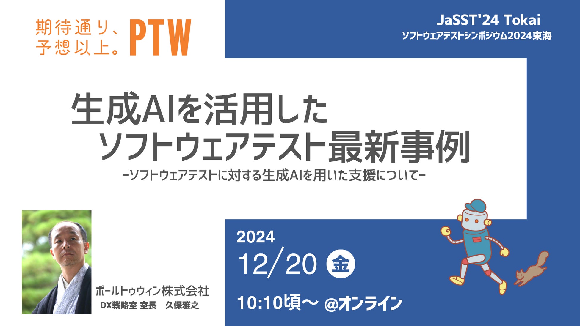 サービス・ライフサイクルの課題解決を支援するポールトゥウィン株式会社(本社:愛知県名古屋市、代表取締役 CEO:橘 鉄平、代表取締役COO:志村 和昭、以下「ポールトゥウィン」)は、2024年12月20日(金)に開催される『ソフトウェアテストシンポジウム2024東海(JaSST'24 Tokai)』にプレミアムスポンサーとして参画します。弊社はAI技術を活用したソフトウェアテストの研究開発を進めており、特にテストの自動化や効率化に力を入れています。同シンポジウムでは、DX推進室長の久保雅之が「ソフトウェアテストに対する生成AIを用いた支援について」というテーマで、講演(オンライン)を行います。AIを活用したテストケース生成の効率化とテストコードの自動生成に焦点を当て、AI技術のアプローチを紹介いたします。