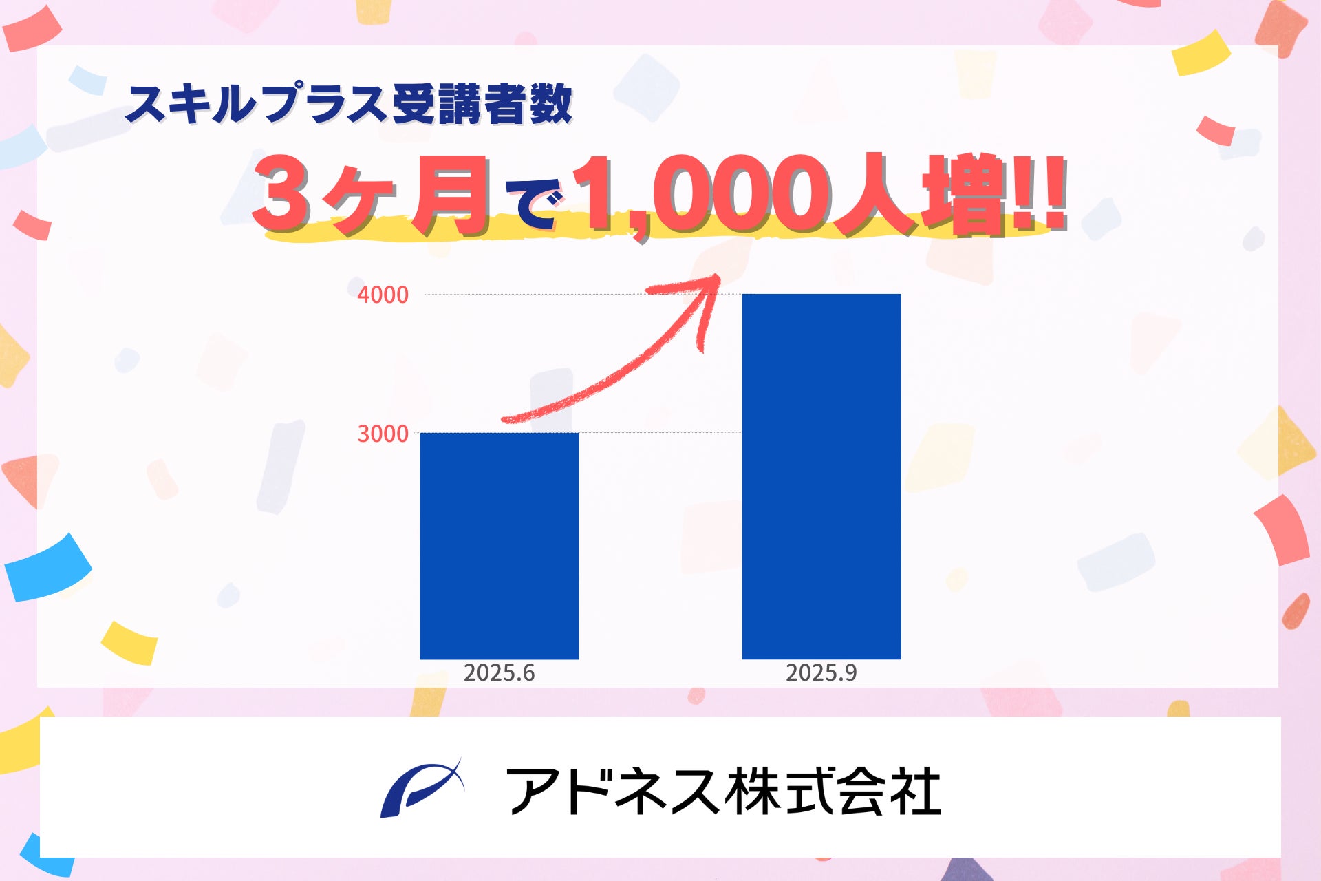 生成AIイノベーションのグローバルリーダー、アドネス株式会社(本社:東京都新宿区四谷、代表取締役社長:三上功太)は、マーケティングやSNS・広告運用、生成AI、セールス、デザインなど、実践的なスキルを効率よく習得できる社会人のためのスキル習得プログラム「スキルプラス」の累計受講者数が、2025年9月時点で4,000人を突破したことをお知らせいたします。