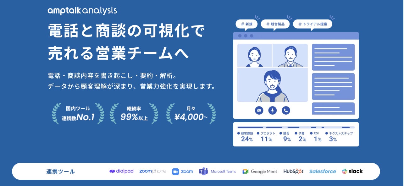 「amptalk analysis」は、IP電話やテレビ会議システムなどあらゆるコミュニケーションツールと連携し、オンライン・オフライン関係なく商談や通話を自動で書き起こし・要約・解析し、Salesforce / HubSpot / Slack / MicrosoftTeamsチャットに自動出力することで、オンライン商談を自動化・可視化します。