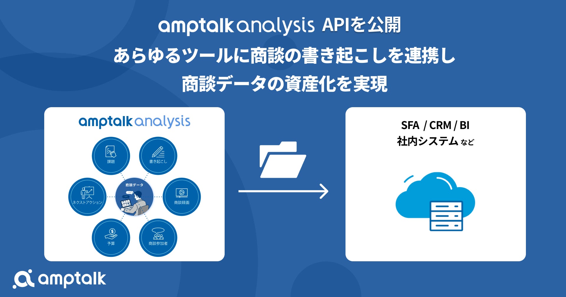 amptalk株式会社(本社:東京都新宿区、代表取締役社長:猪瀬竜馬、以下 amptalk)は、電話・商談解析ツール「amptalk analysis(アンプトーク アナリシス)」のAPIを公開しました。これにより商談の書き起こしなどの解析情報をあらゆるSFAやCRM、その他のツールに連携することが可能になります。