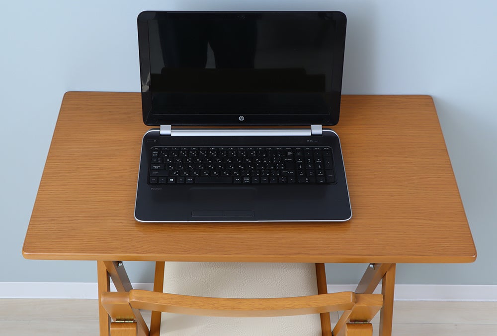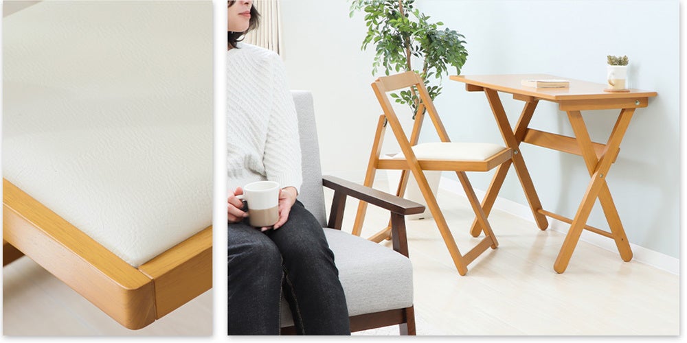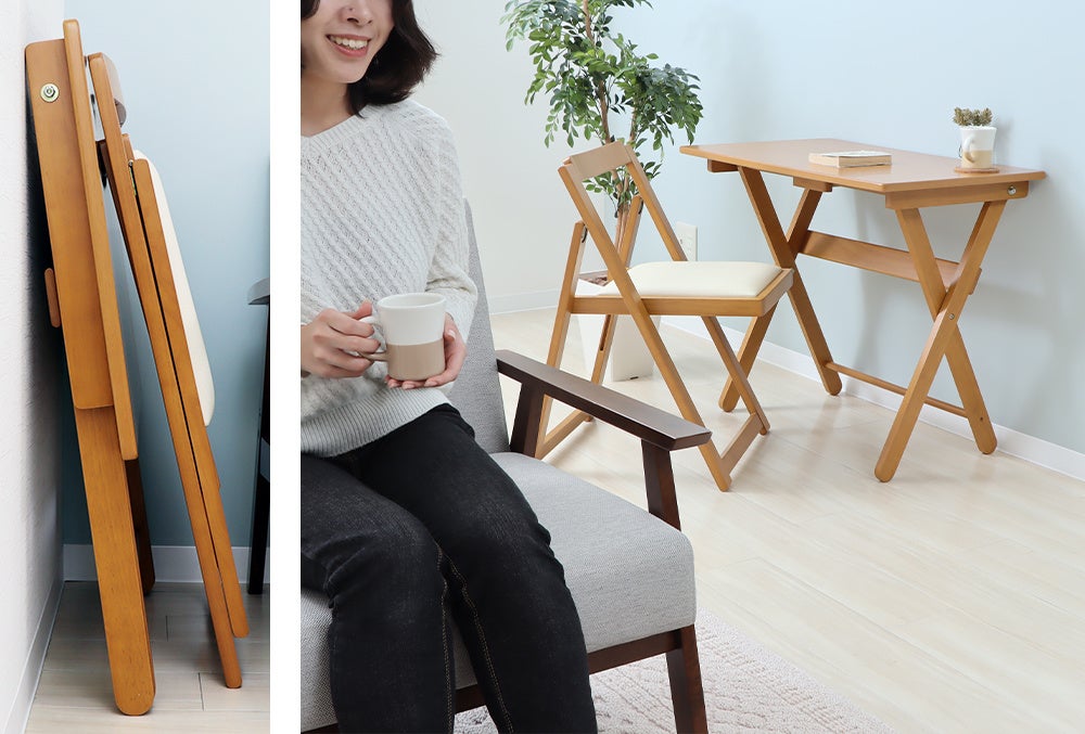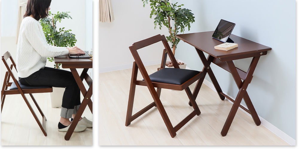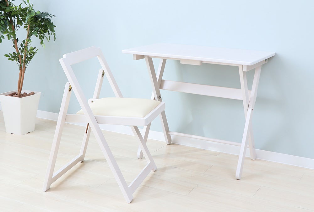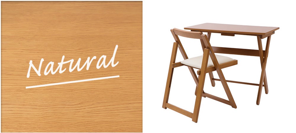 天然木の風合いが優しい「折りたたみデスク&チェアセット」は、チェアはもちろん、デスクも折りたたみが出来るので、使わないときはさっと畳んでしまえるところが魅力です。またコンパクトなサイズ設計なので、限られたスペースでも使いやすい便利さ、クッション性のある座面が体にやさしいこと、シンプルなデザインがどんなお部屋にも馴染むことなど、お客様からの多くの「いいね!」がロングセラーの理由となっています。