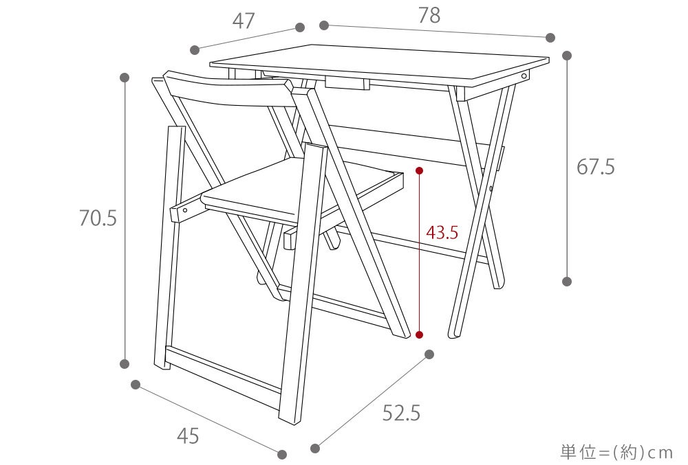 - サ イ ズ :<デスク>(約)幅78×奥行47×高さ67.5cm、<チェア>(約)幅45×奥行52.5×高さ70.5cm(座面高さ)43.5cm