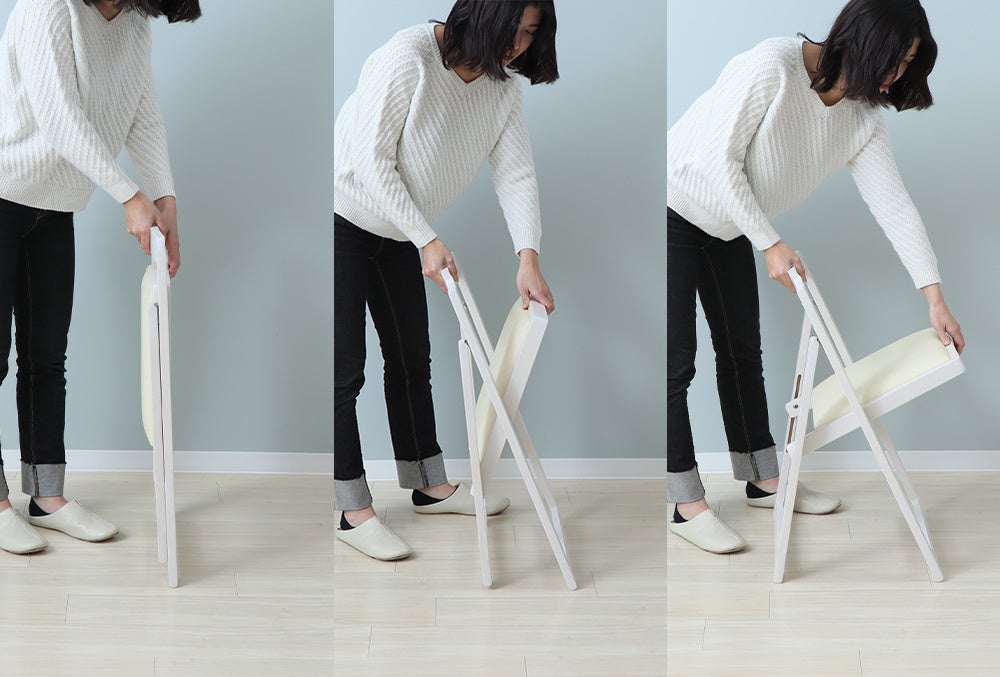 折りたたまれたチェア座面を自分の方に向けます。シート部分を外側に開くだけ。