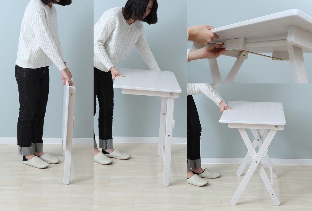 折りたたまれた天板側を自分の方に向けます。天板を手前に持ち上げ、天板裏にある脚支え部分を持ち、手前にすっと引くと脚が開きます。