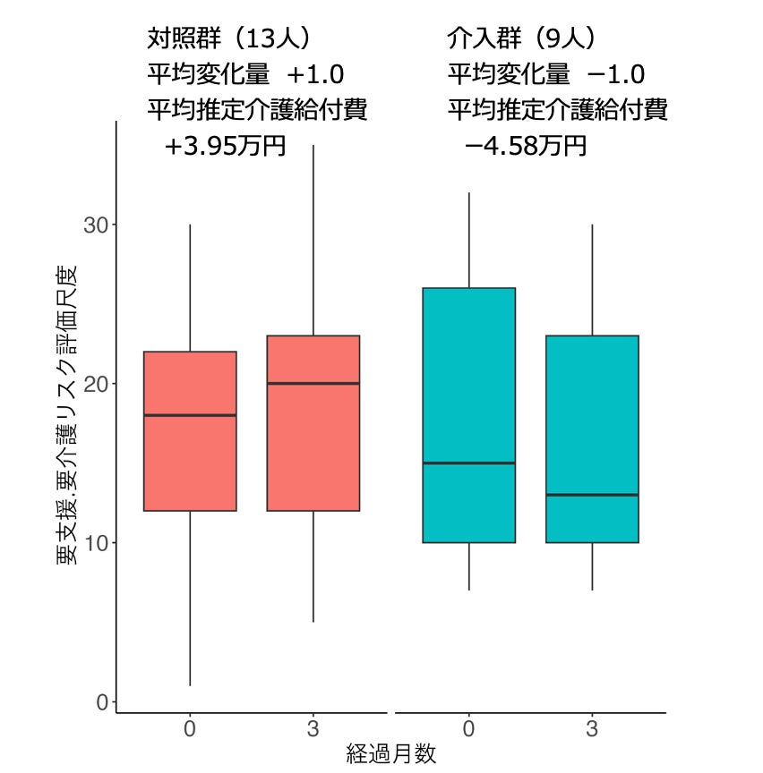 これまでの研究では、要支援・要介護リスク評価尺度が低い群(16点以下)では1点あたり0.89万円、高い群(17点以上)では1点あたり7.53万円の6年間介護給付の費増加が報告されています。この知見を基に、本研究の介入群および対照群のリスク評価スコアを6年間累積医療介護給付費に換算しました。その結果、介入群では平均推定介護給付費が4.58万円減少し、一方で対照群では3.95万円増加しました。このことから、介入群と対照群の差分として、一人あたり約8.5万円の6年間累積介護給付費削減効果があると推定されました。