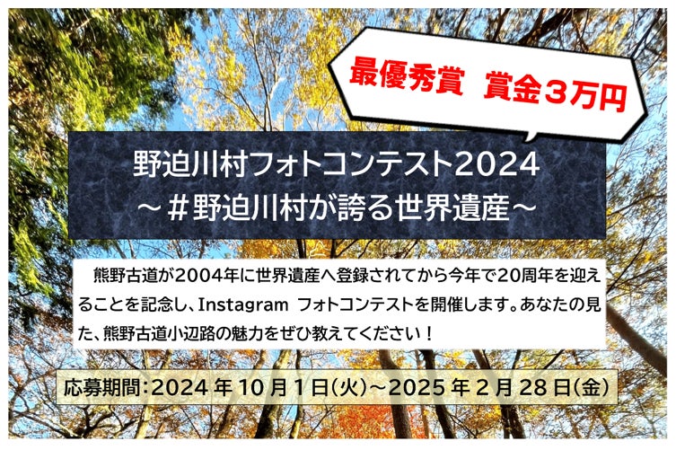 熊野古道が2004年に世界遺産へ登録されてから、今年で20周年。それを記念し野迫川村では、小辺路の素敵な写真をシェアするInstagramフォトコンテストを2025年2月28日(金)まで開催中。最優秀賞受賞者には賞金3万円が贈呈されるなど、多くの人に熊野古道の魅力が伝わる企画となっています。