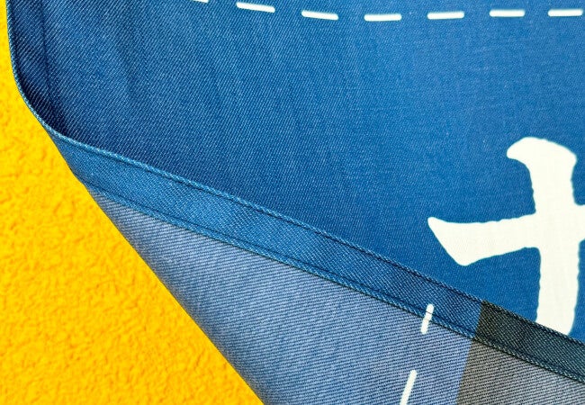 「デニム日除け幕」は、綿37%、ポリエステル63%の配合比率で作られた新素材『ポリデニム』を採用。ポリエステルベースの生地により、従来の染めでは表現できなかったフルカラー印刷が可能となり、写真やグラデーションなどを鮮明に表現できます。この生地は、デニムの風合いとポリエステルの機能性を兼ね備え、カジュアルな雰囲気を演出します。