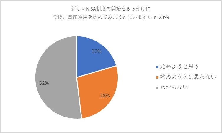 最後に、資産運用を「行っていない」と回答した2,399人に「新しいNISA制度の開始をきっかけに今後、資産運用を始めてみようと思いますか」と聞きました。その結果、最も多かった回答は「わからない」(52パーセント)でした。次は「始めようとは思わない」(28パーセント)で、「始めようと思う」との回答は20パーセントに止まりました。
