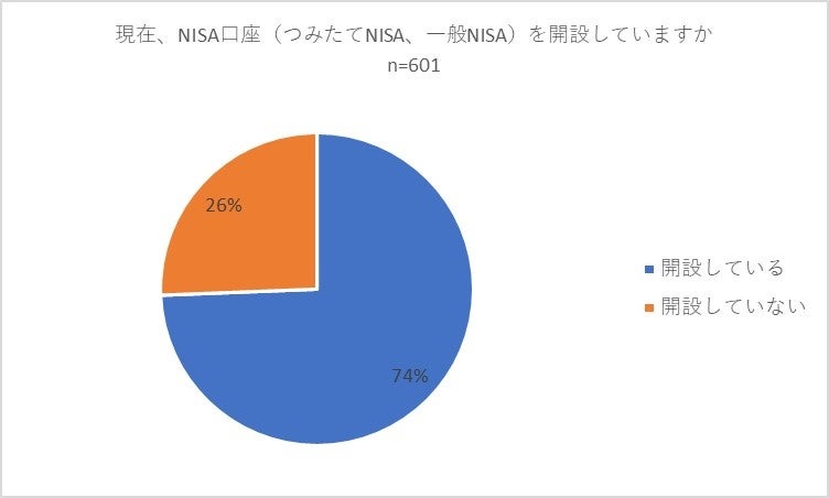 次に資産運用を「行っている」と回答した601人に対して「現在、NISA口座(つみたてNISA、一般NISA)を開設していますか」と質問したところ、74パーセントが「開設している」と回答。26パーセントの「開設していない」を大きく上回りました。