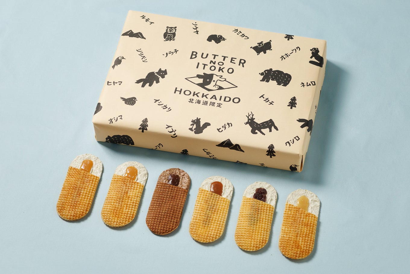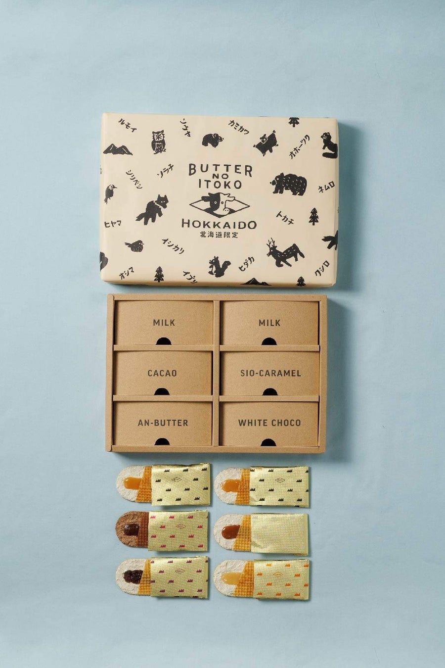 定番商品のミルク、チョコ、あんバター、塩キャラメル味に加え、北海道をイメージした「ホワイトチョコ」味が入った、5種類 計18枚の贅沢なアソートBOXです。