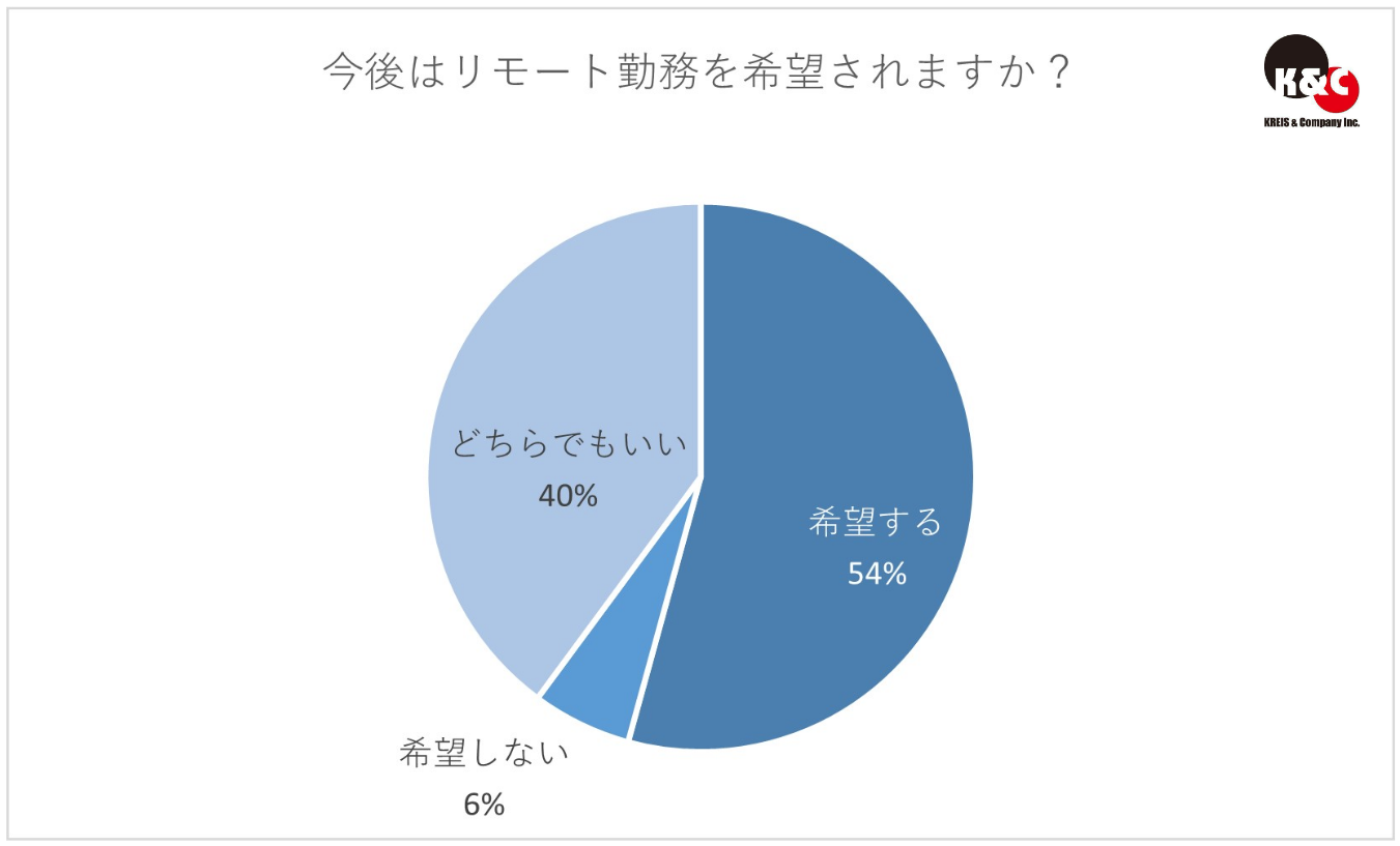 リモートワークを希望すると回答した人は半数以上となり、実態は出社が増えているものの、依然として希望は強いことが明らかになりました。希望理由としては、「自宅で子育てしながら勤務をしたい」「遠方に引っ越した、いずれ遠方へ引っ越す予定である」「通勤時間を削って効率的に働きたい」「家族の介護」などが挙げられました。一方で「どちらでもいい」と回答した割合も4割にのぼり、仕事の内容や会社のルールにしたがって柔軟に勤務する姿勢も見られます。