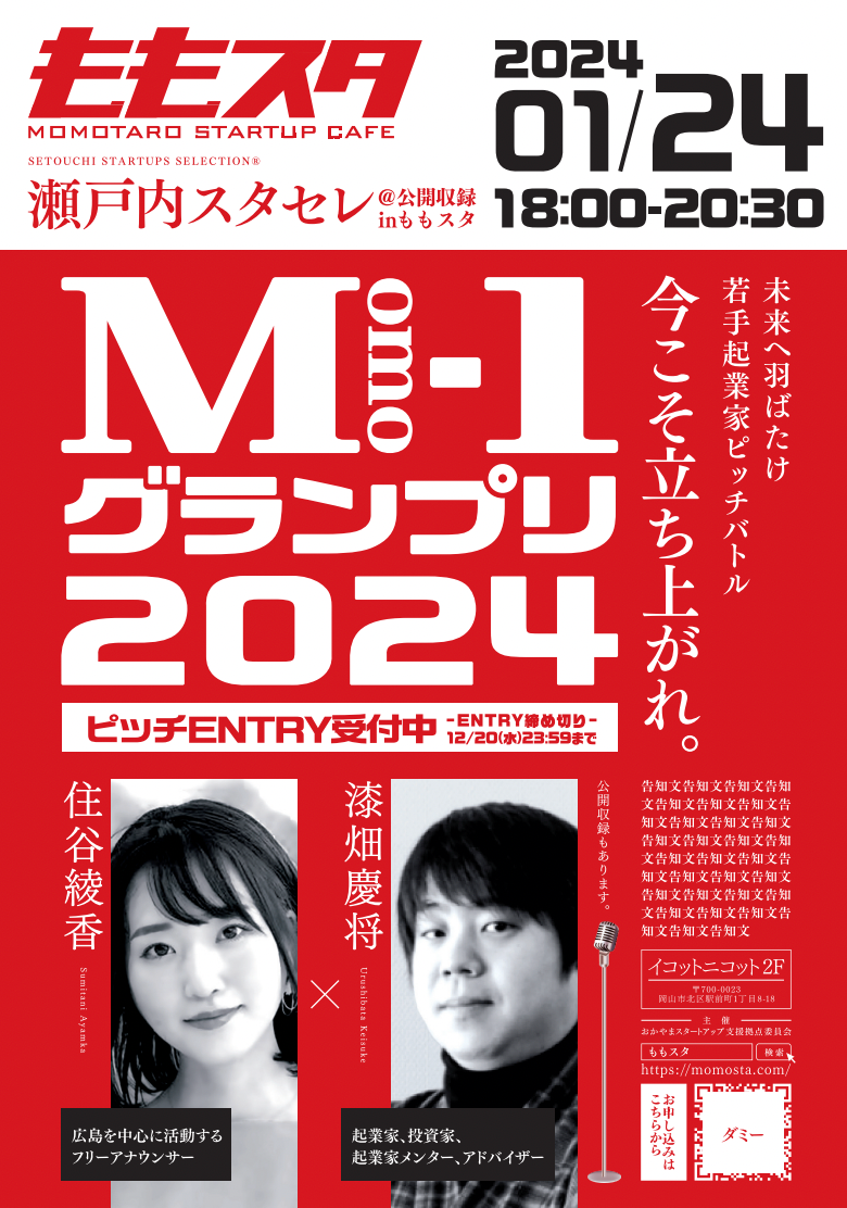 この「Momo-1グランプリ」は、それぞれの熱い思いやビジネスモデルをピッチ形式でプレゼンテーションして頂き、ピッチバトルを行います。優勝者にはRSK山陽放送を始めとする中国エリア5県でお聞き頂ける「瀬戸内スタートアップセレクション」への番組出演権をプレゼントいたします。また、当日は出張の公開収録として、優勝者にはその場でご出演頂き、収録形式でその模様を後日に放送させて頂きます。アーリーステージの起業家の方や、まだプレシード段階のスタートアップの方々の「熱い思い」に重点をおいて評価いたします。