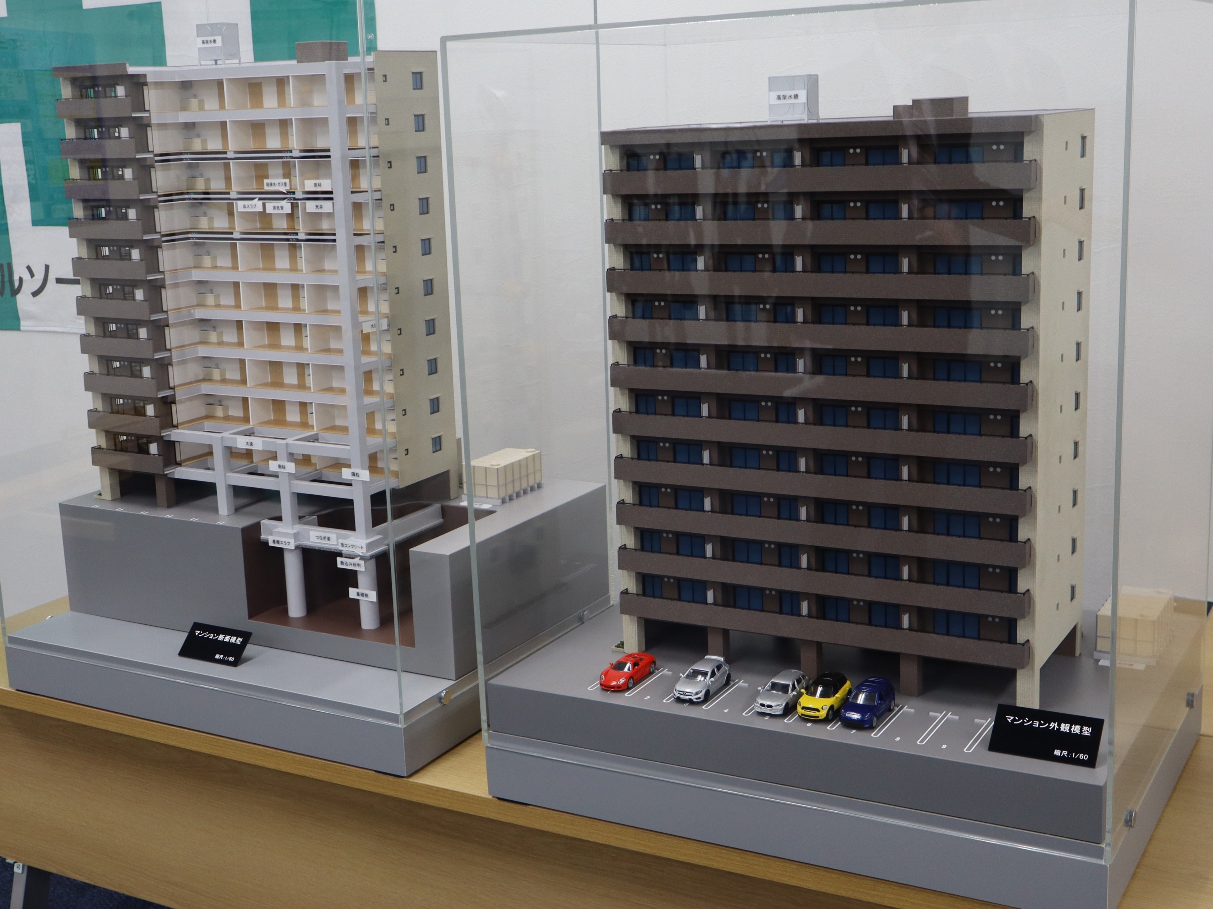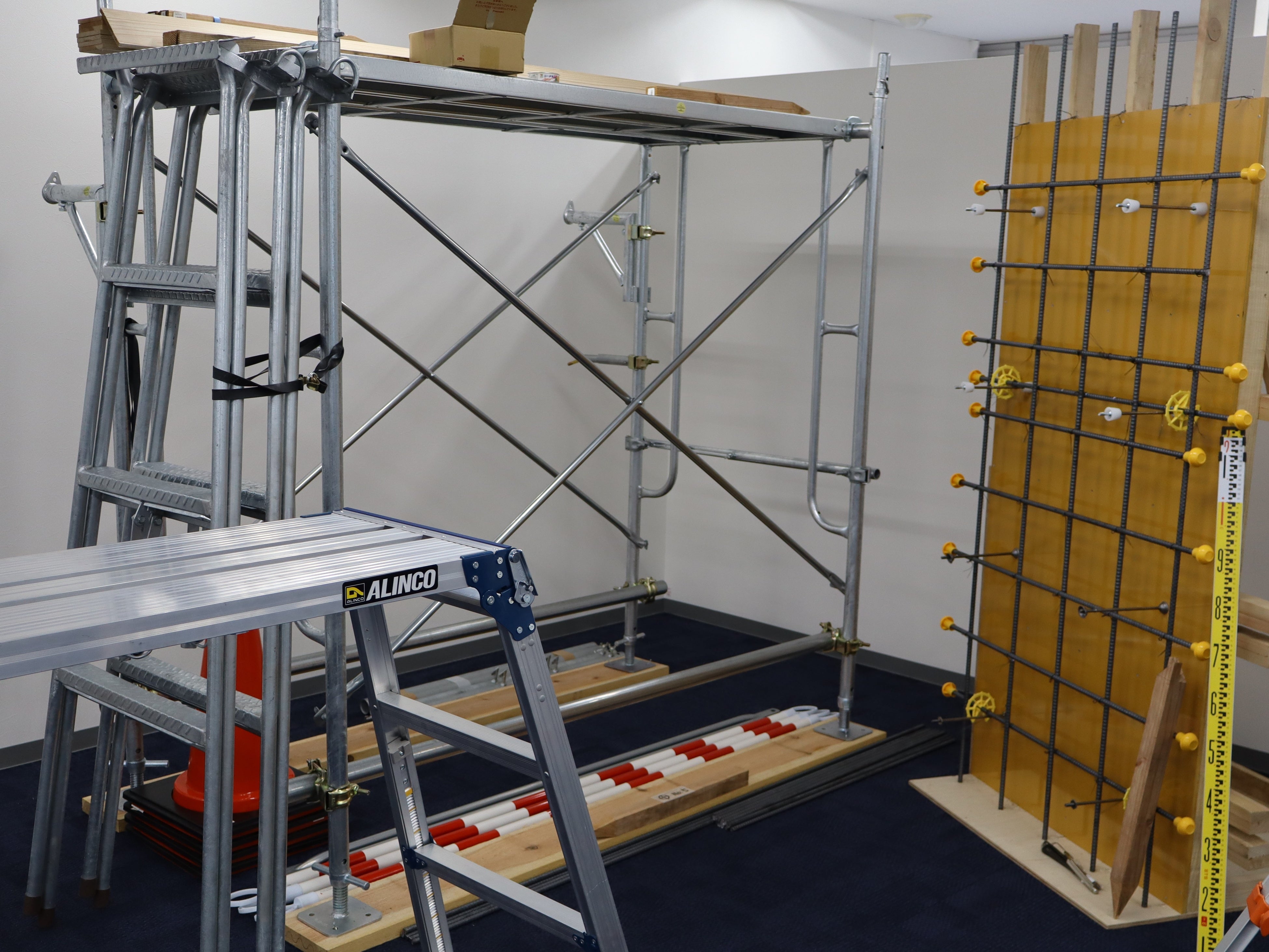 拡張移転にあたり、当社技術センター初となる現場作業を体験できる実技スペースを新たに完備いたしました。建築物を立体的に学習できる建築模型を設置するほか、建築資材を使用した作業や安全装具、脚立足場などを体験できるコーナーを設けるなど、安全教育に関わる研修内容を拡充しました。また、基礎的な知識や心構えを学ぶ機会を提供することで、派遣先企業の現場での業務がより安全かつ円滑になることを目的としております。