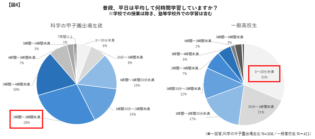 ■科学の甲子園全国大会出場生徒の平日学習時間は「2~3時間」が最多。