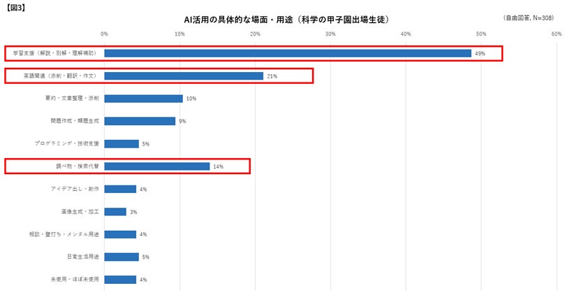 ただ、科学の甲子園出場生徒は、学習での活用割合が日常生活での活用割合よりも14ポイント高く、学習場面でより積極的にAIを活用していることがわかります。さらに、具体的にどのような場面・用途でAIを活用しているかを自由回答で尋ねた際も、「学習支援(解説・別解・理解補助)(49%)」「英語関連(添削・翻訳・作文)(21%)」「調べ物・検索代替(14%)」など学習に関する回答が多くを占めました【図3】。