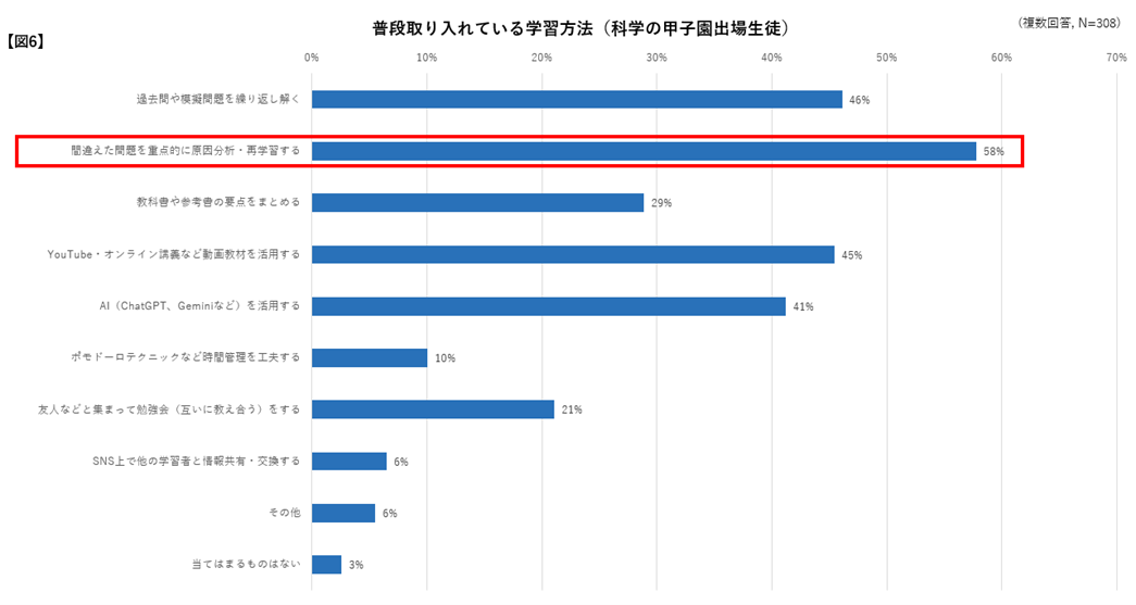 科学の甲子園出場生徒に普段取り入れている学習方法について尋ねたところ、半数以上が「間違えた問題を重点的に原因分析・再学習する(58%)」と回答しました。先述の「AIを活用する」だけでなく、「過去問や模擬問題を繰り返し解く」「YouTubeなどの動画教材を活用する」「要点をまとめる」「友人との勉強会」なども多く、従来の基本的な方法から現代ならではのデジタルを活用する手法まで、自身の学習スタイルにあわせて、様々な方法を柔軟に組み合わせている様子がうかがえました【図6】。