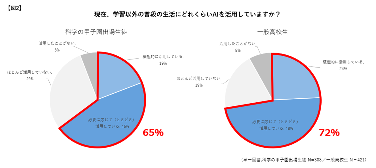 普段の学習にどのくらいAIを活用しているかを尋ねたところ、科学の甲子園出場生徒、一般高校生ともに、「積極的に活用している」「必要に応じて活用している」の合計は79%で【図1】、学習以外の普段の生活におけるAIの活用については、科学の甲子園出場生徒65%、一般高校生72%(いずれも「積極的に活用している」「必要に応じて活用している」の合計)でした【図2】。今や高校生の4人に3人が普段の学習や日常生活においてAIを活用している実態が明らかとなりました。