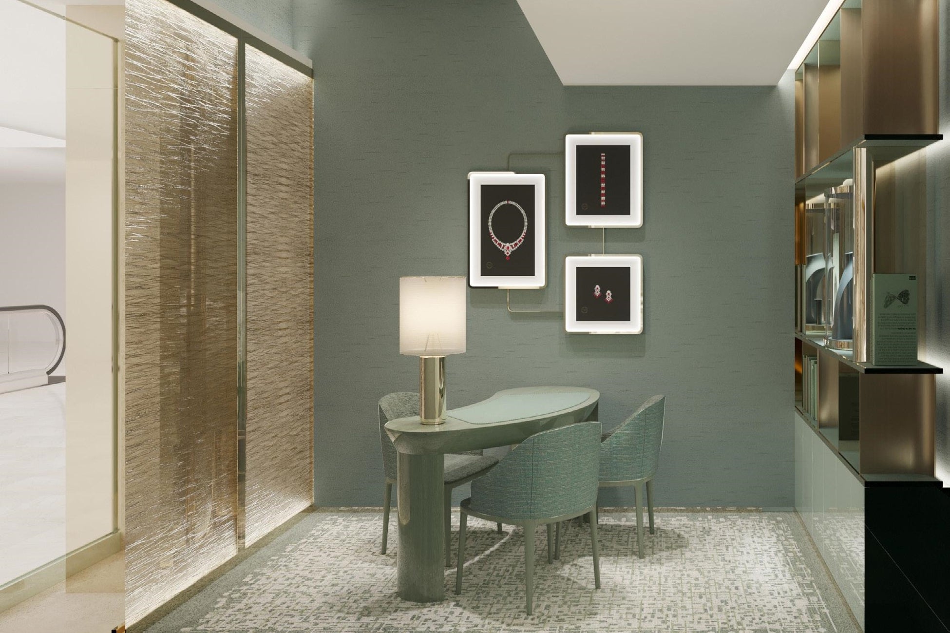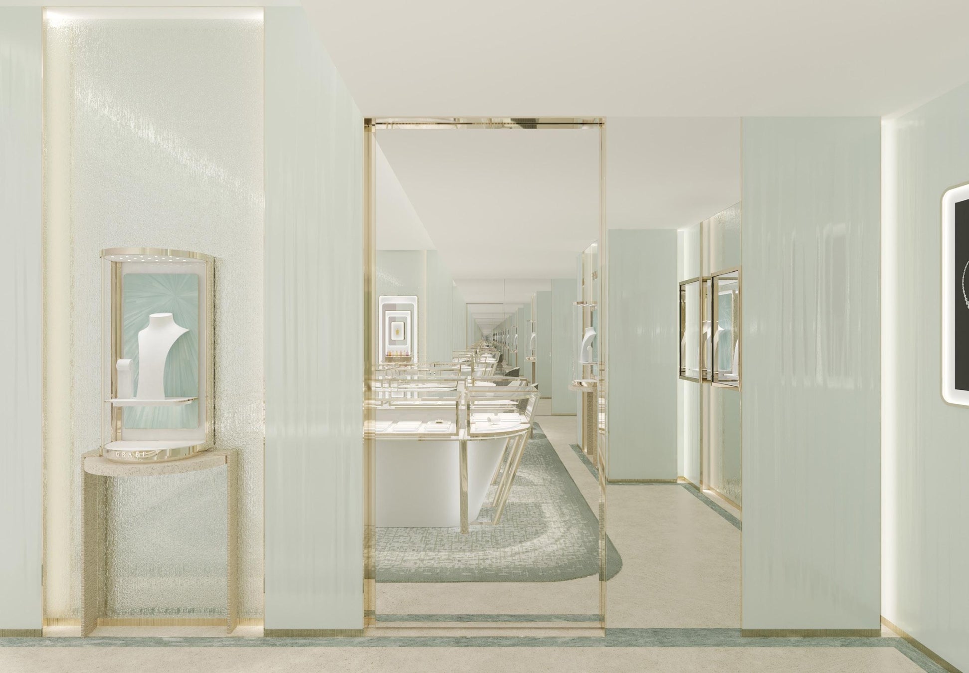 2店舗共に、ファサードには美しいセラドンカラーが施され、サンバーストをイメージしたチズルドグラスパネルの輝きと共に、店舗の外観に上質な明るいイメージを創り出しています。店舗に足を踏み入れるとまず広がるのがブライダル&コレクションエリア。こちらも壁面にはフェミニンなセラドンカラーの漆喰にマザーオブパールが散りばめられた光り輝くシアーな質感のウォールに、ペールゴールドのチズルドグラスウォールが重なり合い、上質な輝きをプラスしています。