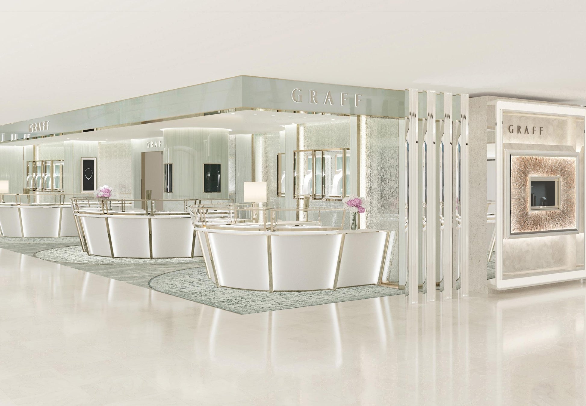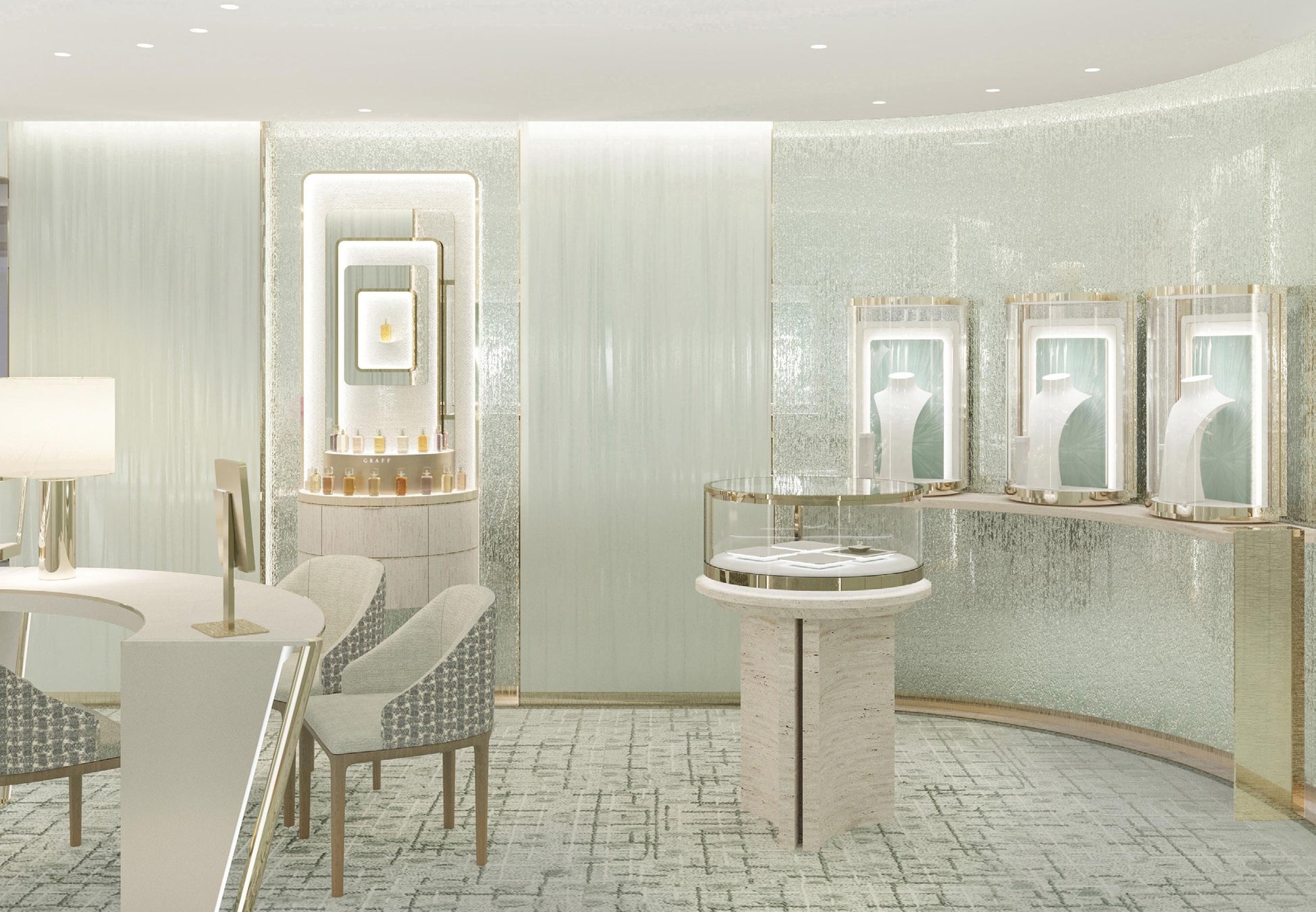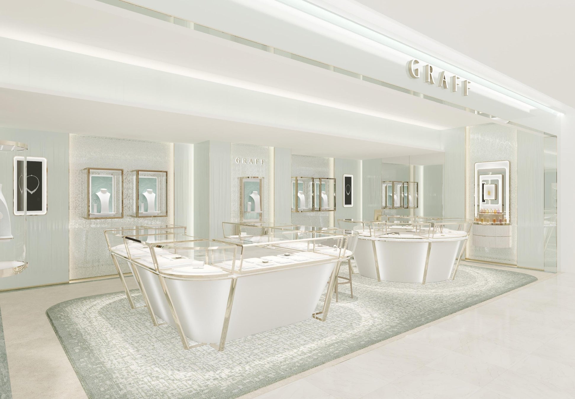 店舗内は、繊細なブークレ状のセラドンカラーのファブリックを用いた椅子をはじめ、フランスの職人がグラフの為に制作した様々なグリーンカラーが織りなすシックなオリジナルカーペットが敷き詰められ、まさにグラフをイメージさせるアイコニックな空間が広がります。その中央には目を引く大きなラウンドやスクエアシェイプの優美なホワイト&ゴールドのカウンターケースが並び、幅広いグラフのジュエリーコレクションやブライダルコレクションをご覧いただけます。