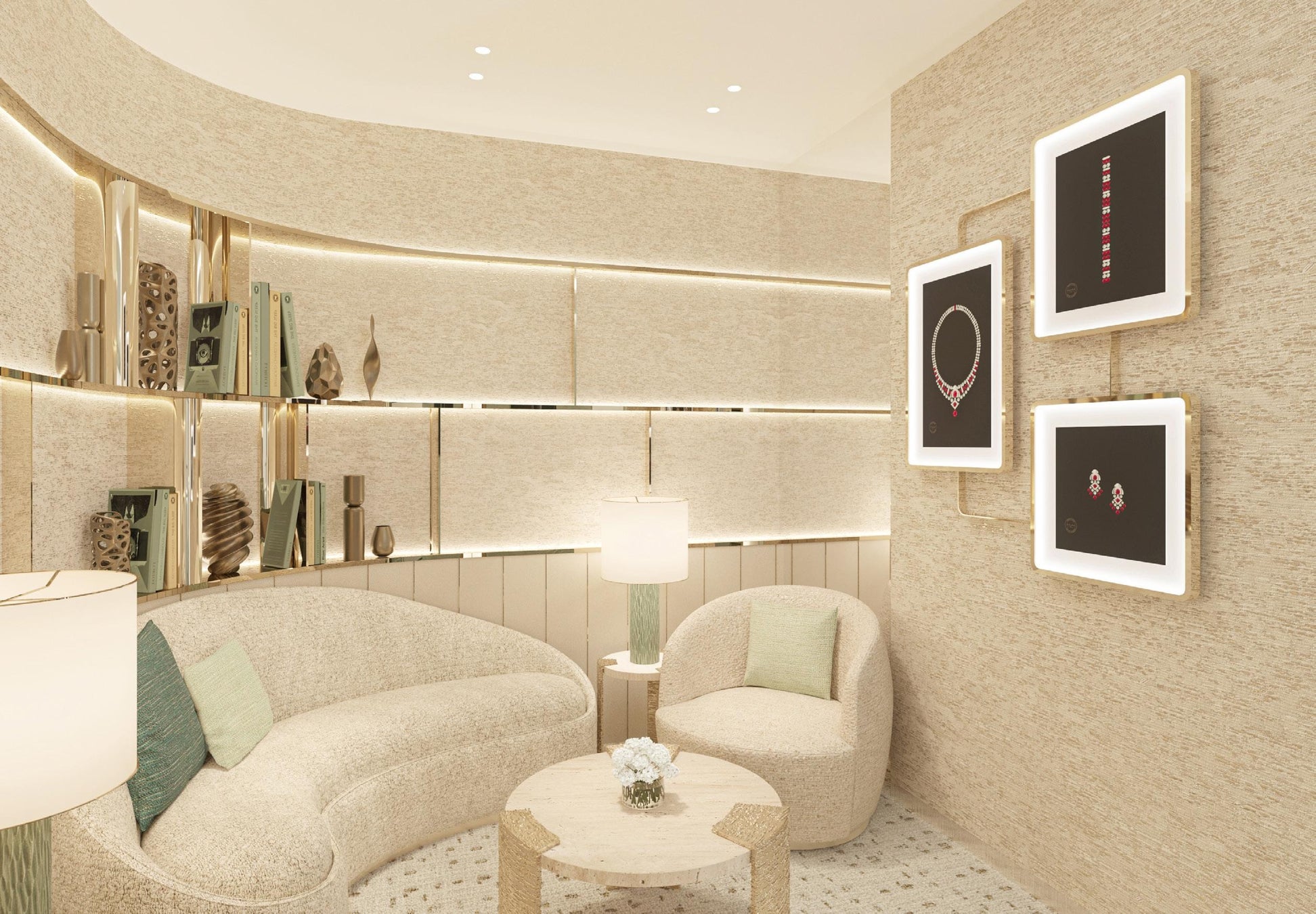 また、ハイジュエリーをごゆっくりご覧いただくために、グラフ伊勢丹新宿店には温かみを感じさせるアイボリー&ゴールド、グラフ髙島屋大阪店にはシックなセラドン&ゴールドと、それぞれが醸し出すエレガントなイメージでプライベートかつ落ち着いたVIPエリアをご用意しております。