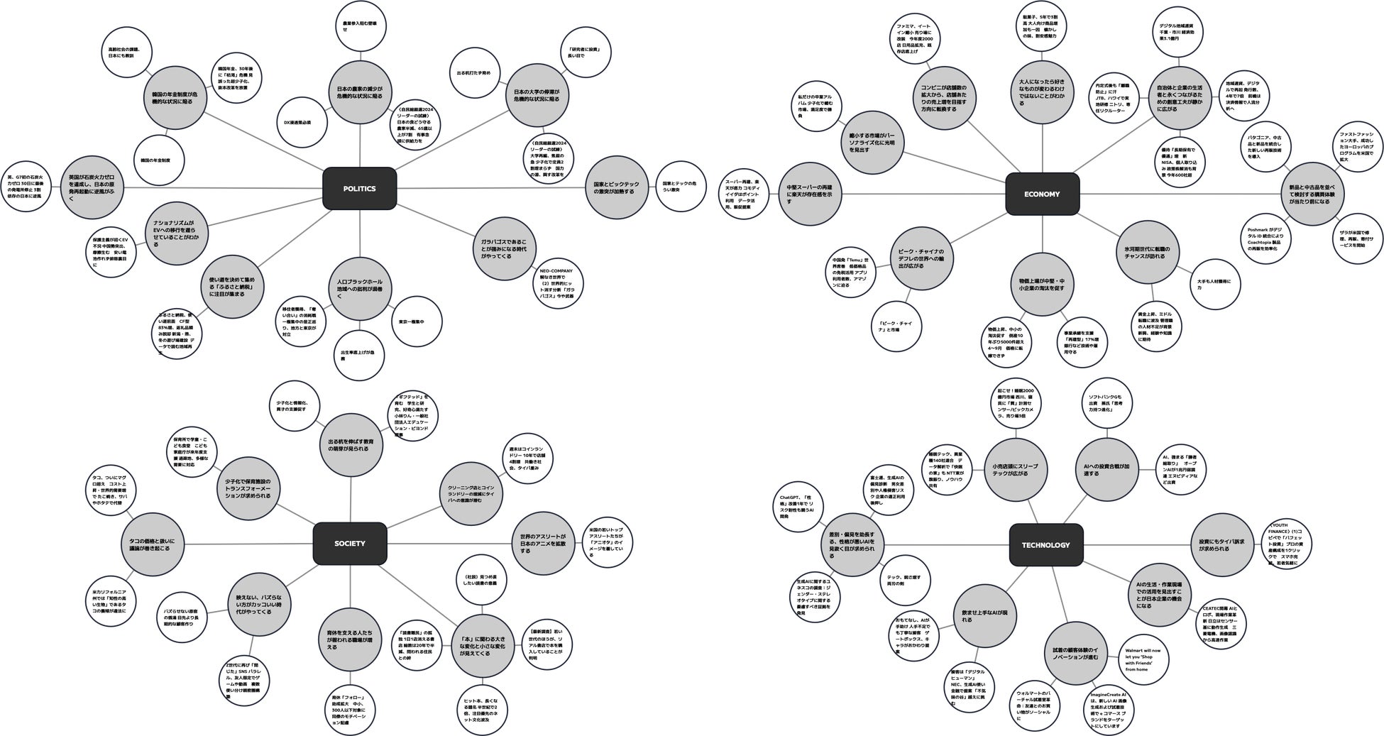 11月号では以下のようなPEST分析のダイアグラムを共有し、その中から9のトピックを発表しました。