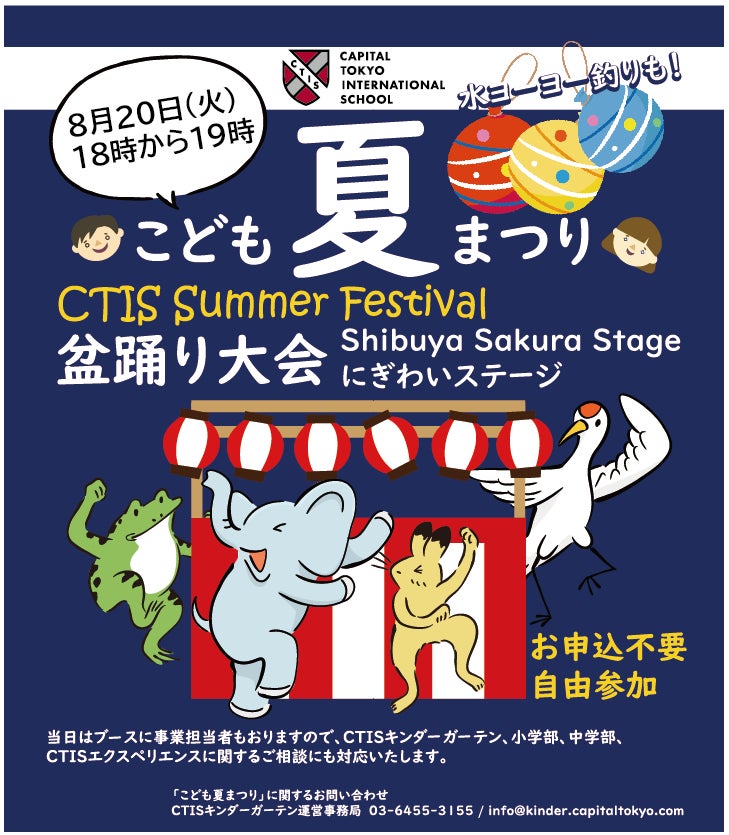 2024年8月20日(火)の18:00から、キャピタル東京インターナショナルスクール(CTIS)の幼稚部である「CTISキンダーガーテン渋谷」は、東急不動産と連携して東京都渋谷区桜丘町にあるShibuya Sakura Stageの「にぎわいステージ」で夏祭りイベント「CTISこども夏まつり」を開催します。盆踊りや水ヨーヨー釣りなどのさまざまな遊びを楽しむことができます。また、CTIS幼稚部、小学部、中学部、アフタースクールの運営メンバーが揃いますので、学校に関するご質問にもお答えします。さらに、CTIS以外の主催するブースやフードトラックなども予定されています。参加には事前エントリーは不要ですので、お誘い合わせの上、ぜひお越しください。