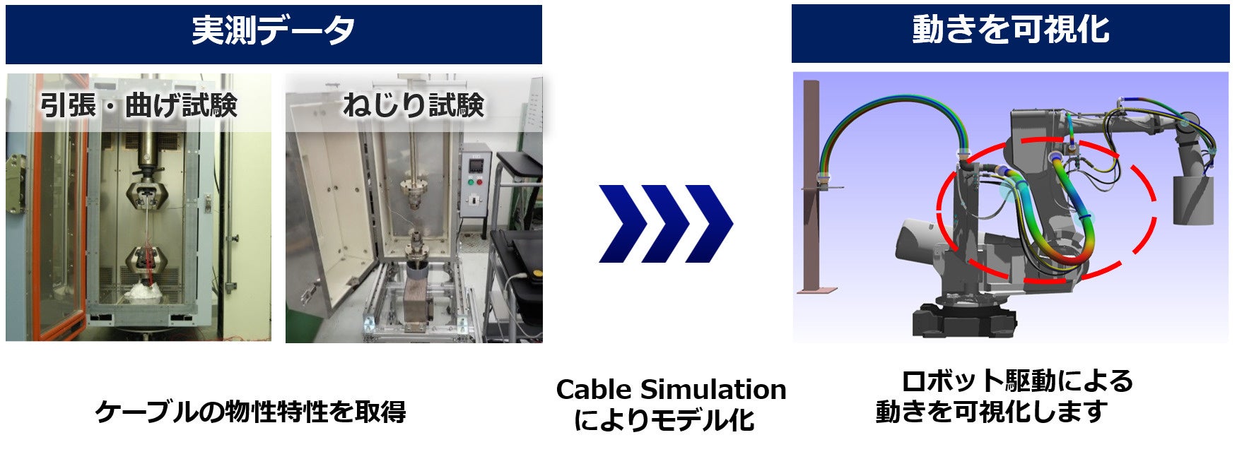 取得した物性データは、「Cable Simulation」などの解析ソフトに直接利用できます。設計者は、ロボットアームや可動ユニットの動作軌跡に合わせて、ケーブル・ホースの曲げ半径や応力集中箇所をシミュレーション。