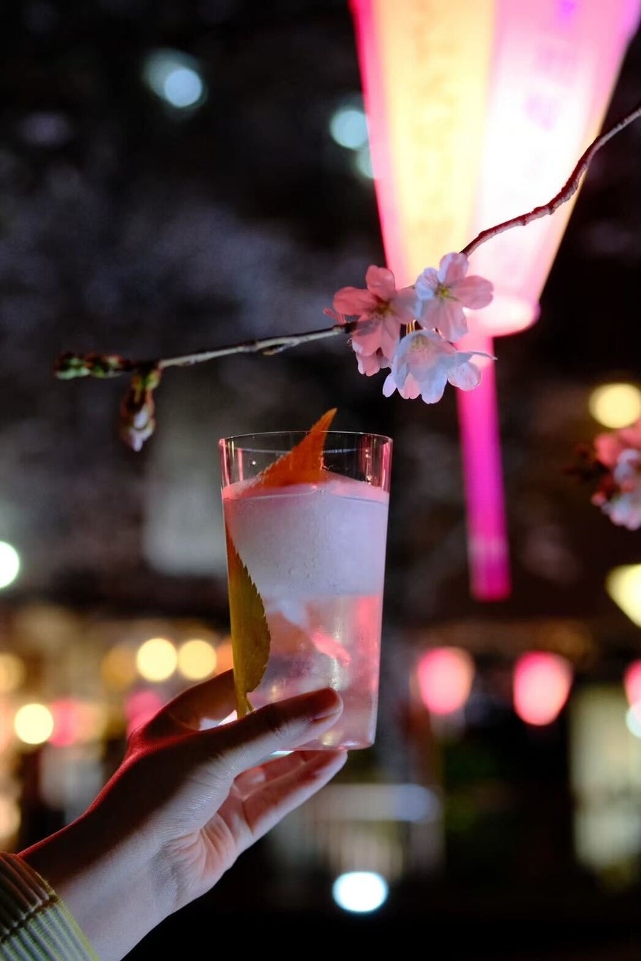 イベント期間中のシグニチャーカクテル「お花見ジントニック」は、桜の花びらを仕込んだ自家製氷に桜の葉が美しく映える、見た目も味も上品な大人のジントニック。
